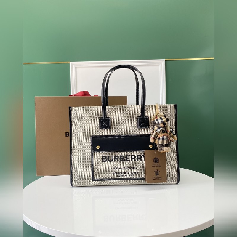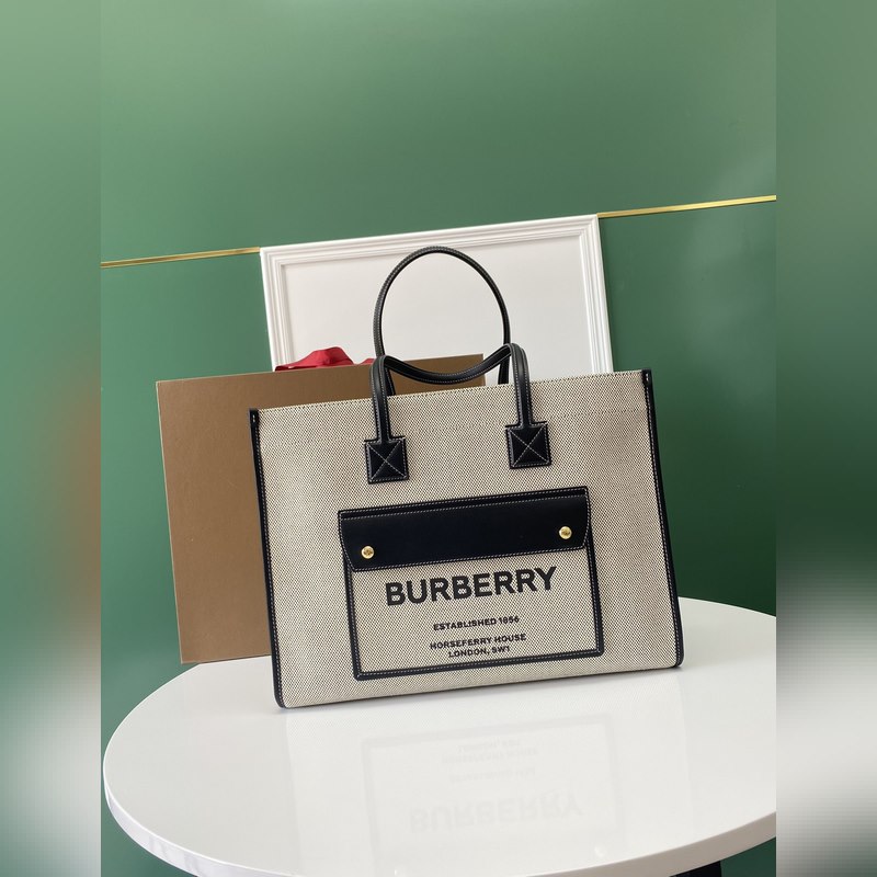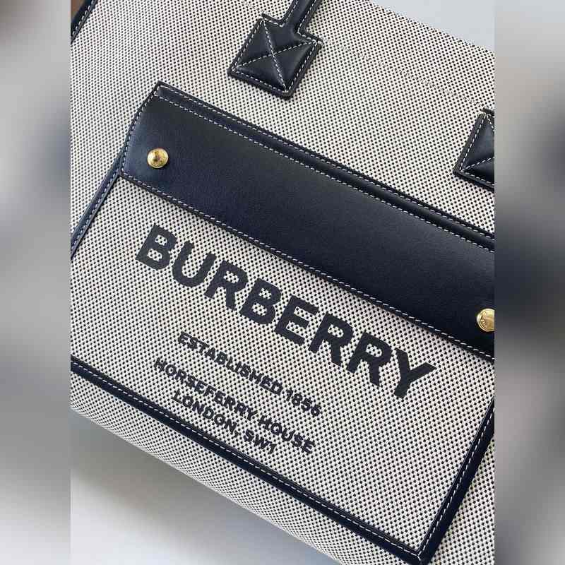 버버리 최신 가죽 소재의 토트백 탑스티치와 코튼 캔버스 소재 브랜드 앞