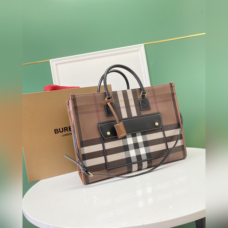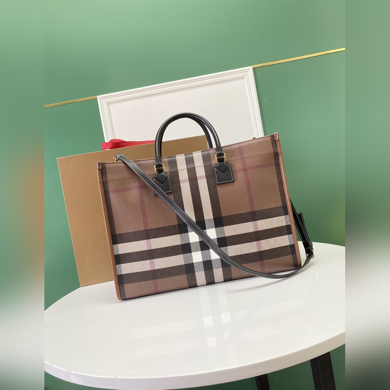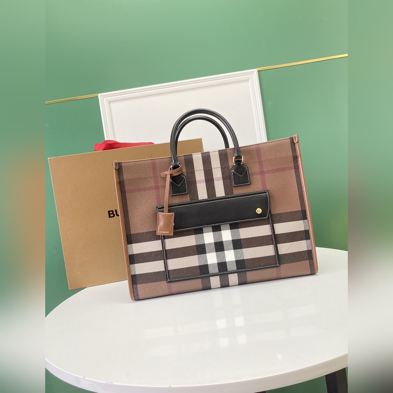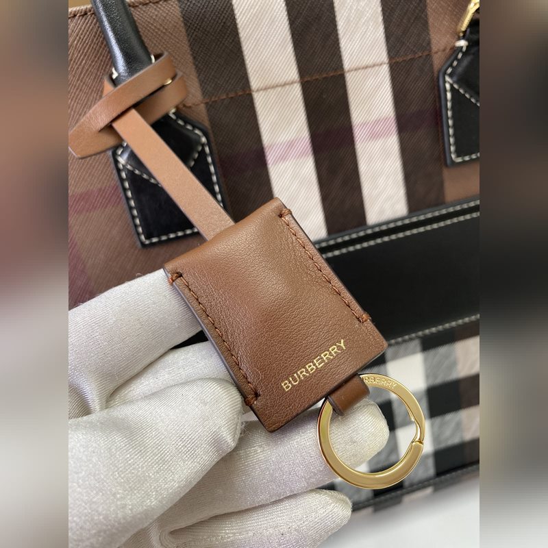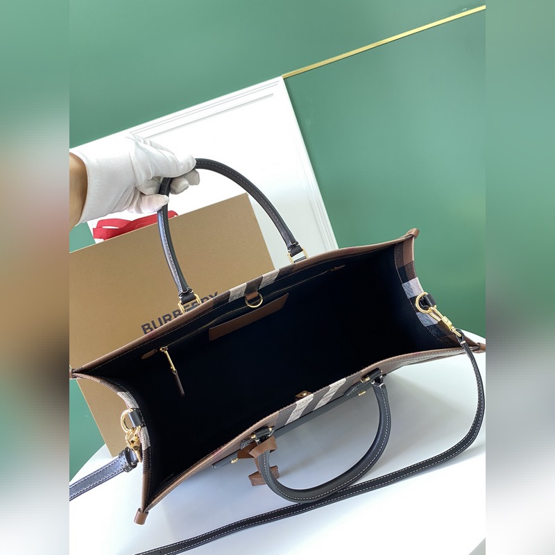 버버리 최신 버치우드 체크 토트백 브라운 체크무늬 소재와 밝은 색상의 스