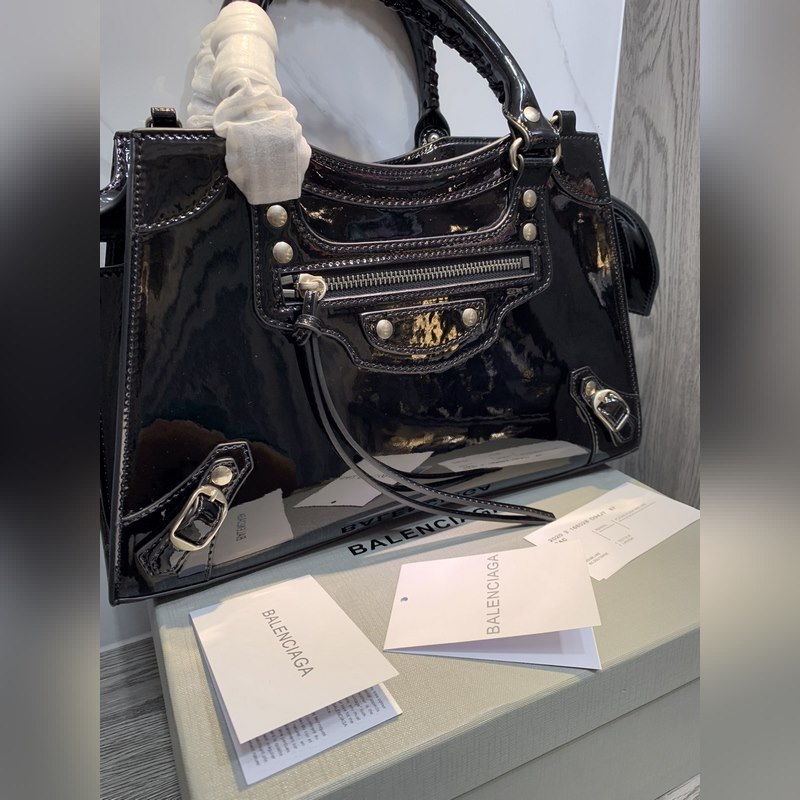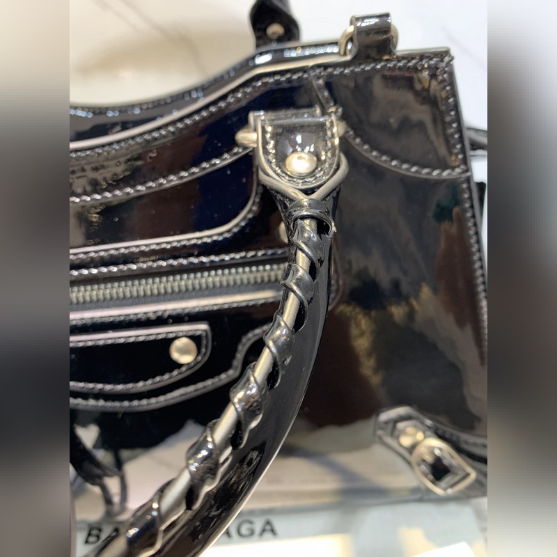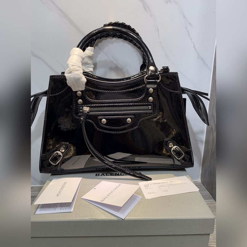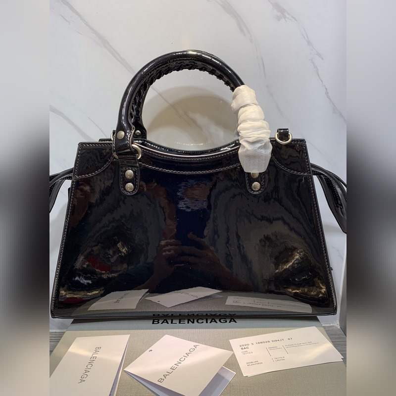 발렌시아가 새로운 오토바이 가방 검은색 특허 가죽 중형 33cm 품번: