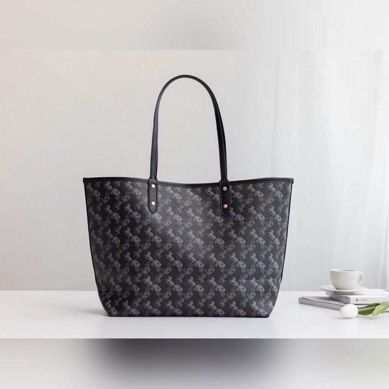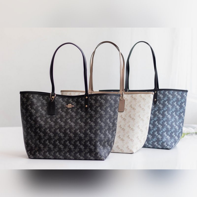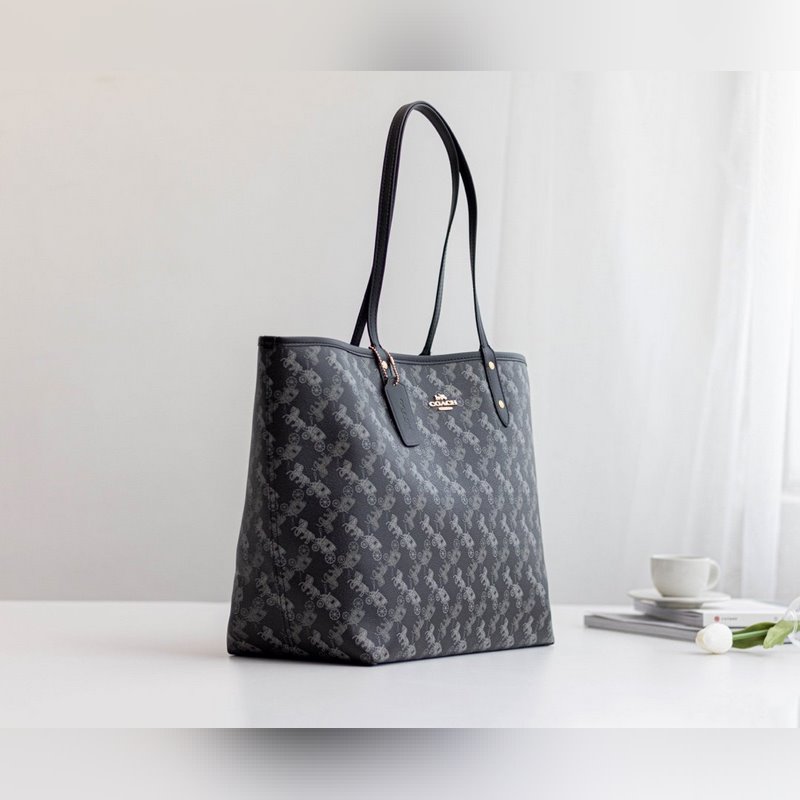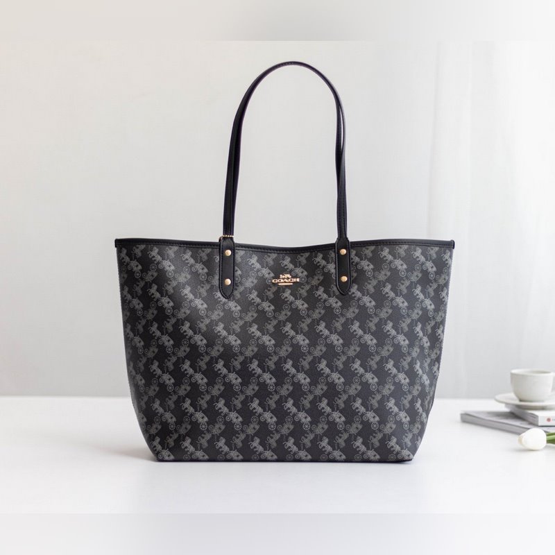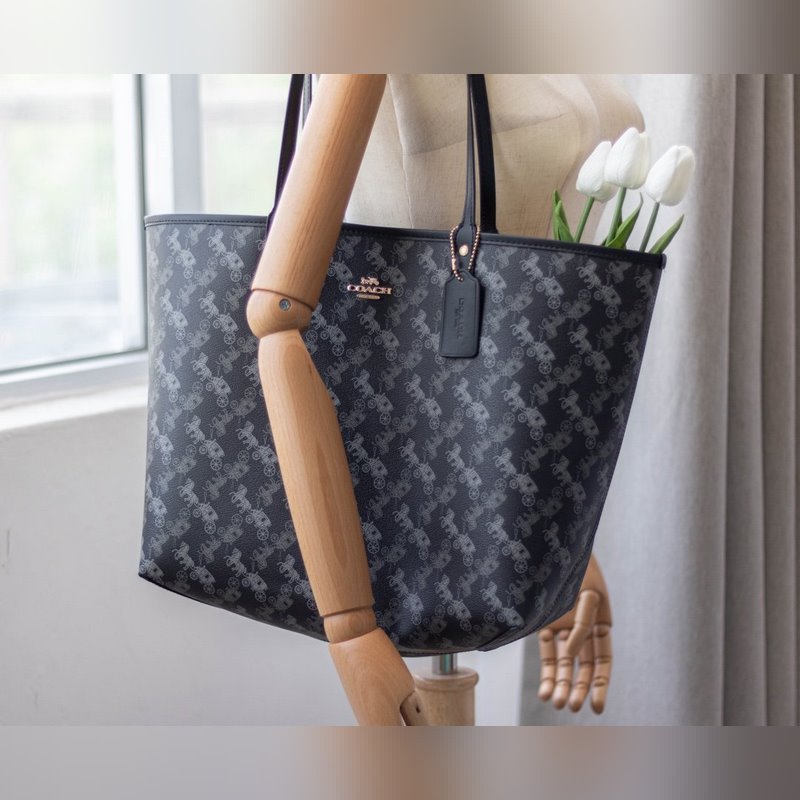 코치 여성용 가방 모델 번호 91107 양면 토트백 앞면은 마차 무늬로
