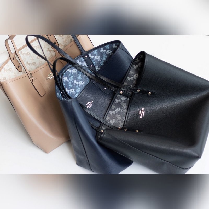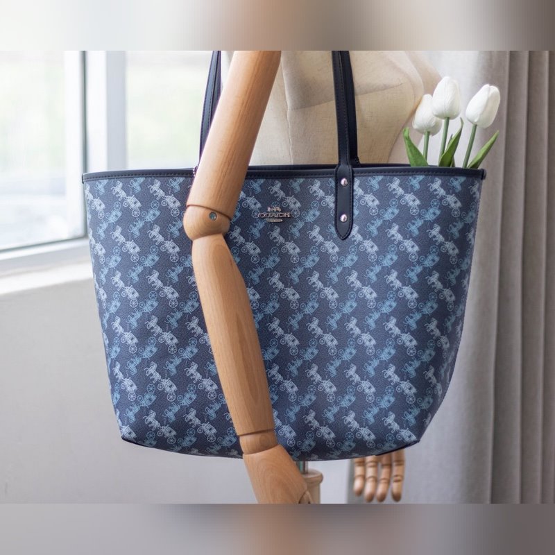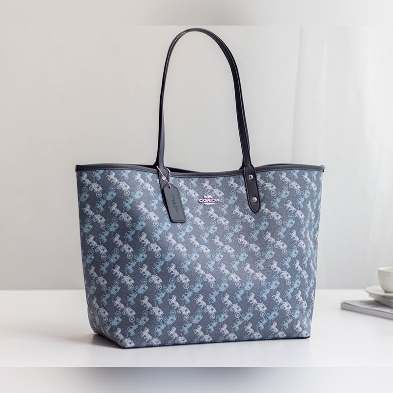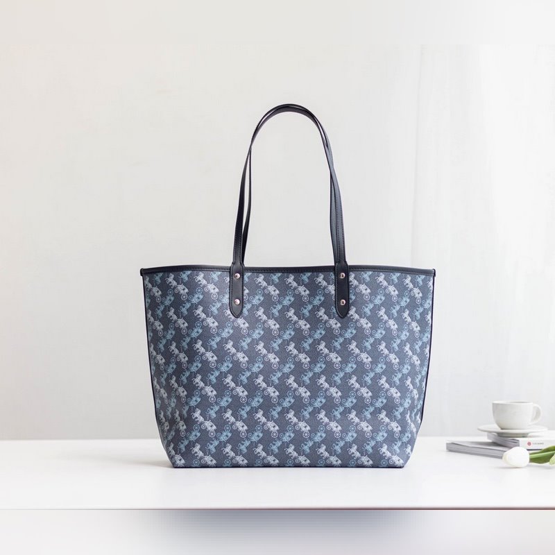 코치 여성용 가방 모델 번호 91107 양면 토트백 앞면은 마차 무늬로