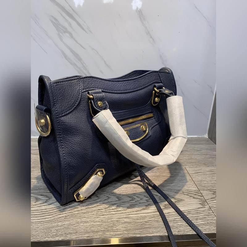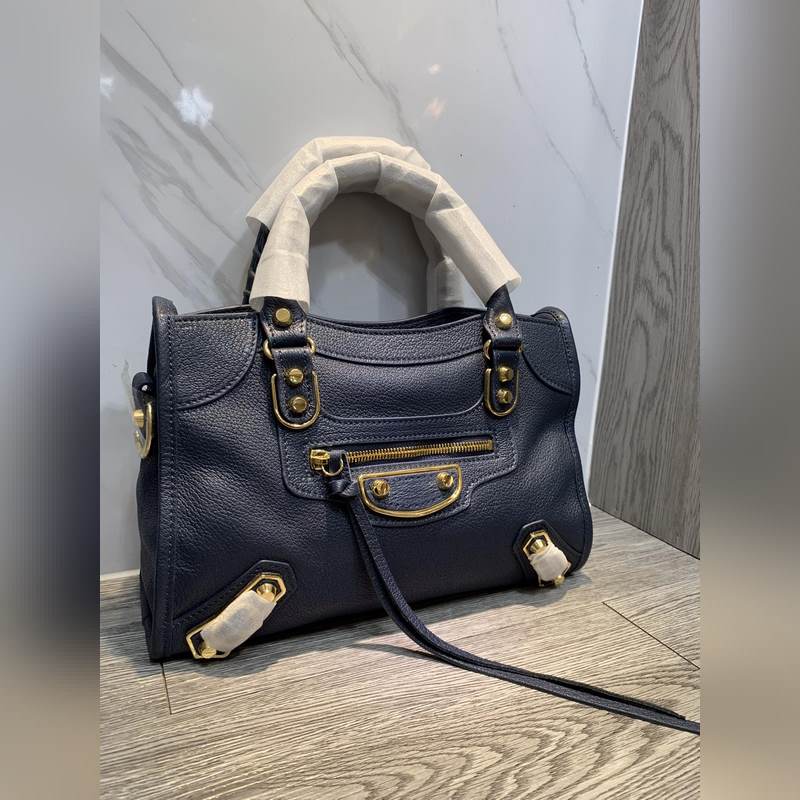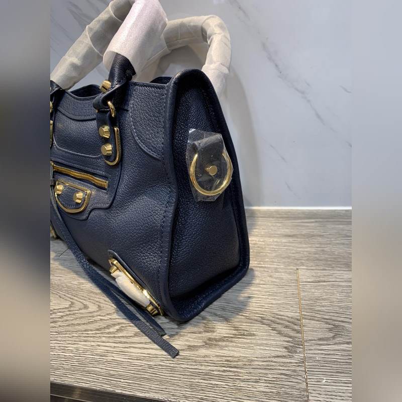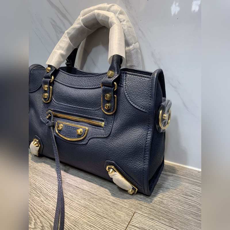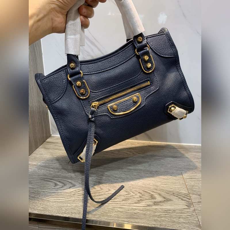 발렌시아가 염소 가죽 오토바이 가방 미디엄 사파이어 블루 골드 스터드