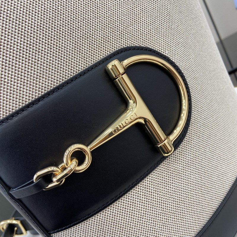 【신제품】 2025 봄/여름 컬렉션에서 Gucci 73은 동명의 연도에서 영감을 받은 아카이브 탭 백을 재해석했습니다. 현대적인 말발굽 모양의 하드웨어 디자인을 특징으로 하며 크로스바디 단일 어깨 스트랩 또는 핸드백으로 사용할 수 있습니다. 천연 캔버스 검은색 가죽 장식 금색 톤 대형 반 말발굽 금속 부품 갈색 면마 소재 라이닝 내부: 지퍼 포켓 1개 어깨 끈 (27cm 높이) 분리 가능한 추가 끈 (50cm 높이) 포함 자석 버튼 개폐식 모델 번호: 833660. 크기: 26cm (너비) x 27.5cm (높이) x 11.5cm (깊이) 색상: 흰색 천에 검은 가죽/원본 가죽. 무게: 약 0.8kg. 이탈리아 디자인