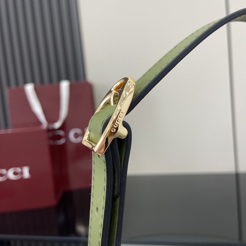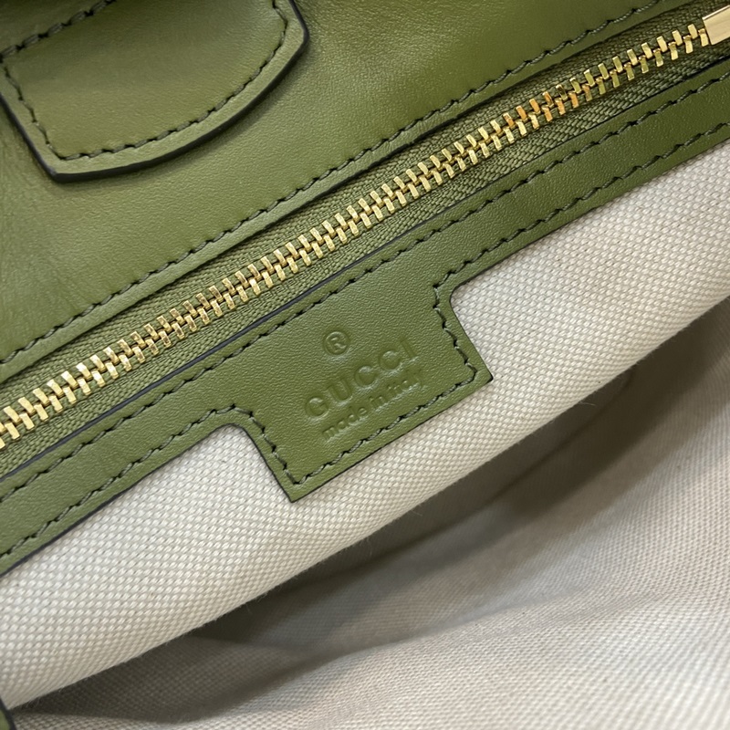 【신제품】 2025 봄/여름 컬렉션에서 Gucci 73은 동명의 연도에서 영감을 받은 아카이브 탭 백을 재해석했습니다. 현대적인 말발굽 모양의 하드웨어 디자인을 특징으로 하며 크로스바디 단일 어깨 스트랩 또는 핸드백으로 사용할 수 있습니다. 녹색 매트 가죽 갈색 가죽 장식 금색 톤 대형 반 말발굽 금속 부품 갈색 면마 소재 안감 내부: 지퍼 포켓 1개 어깨 끈 (19cm 높이) 분리 가능한 추가 끈 (50cm 높이) 자석 버튼 개폐식 모델 번호: 833665. 크기: 18.5cm (너비) x 20cm (높이) x 8.5cm (깊이) 무게: 약 0.5kg. 색상: 녹색 매트/원본 가죽. 이탈리아 디자인