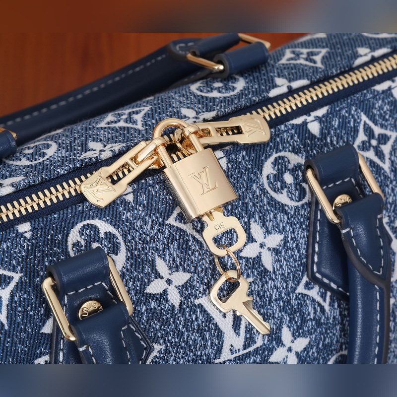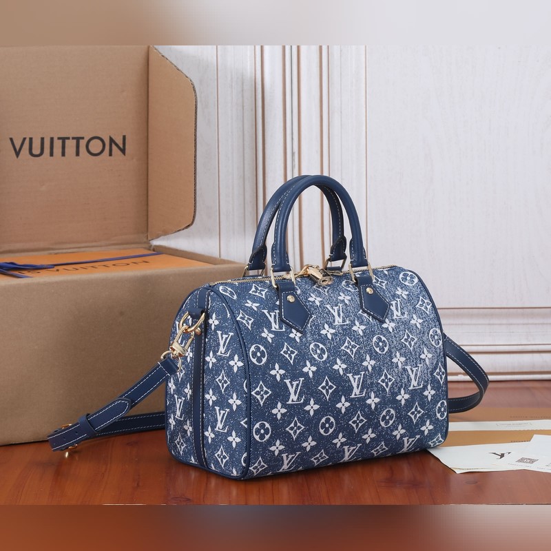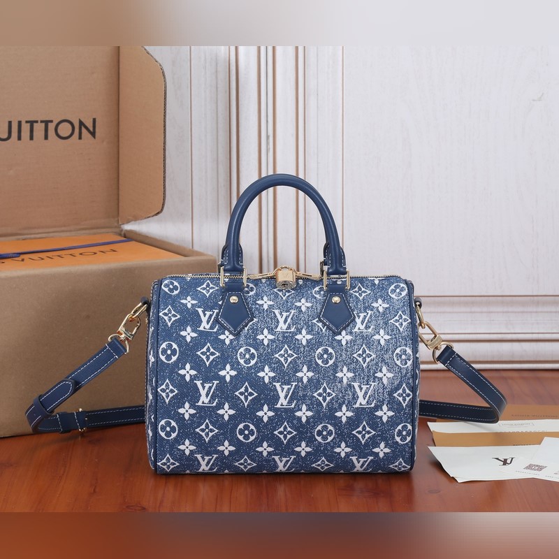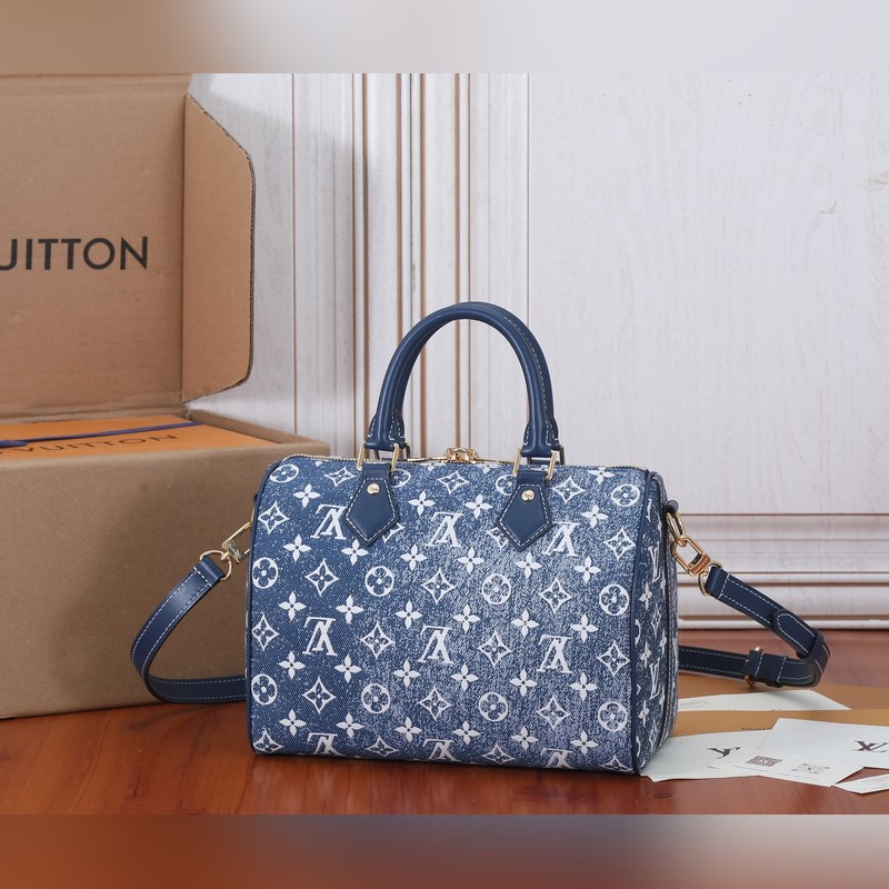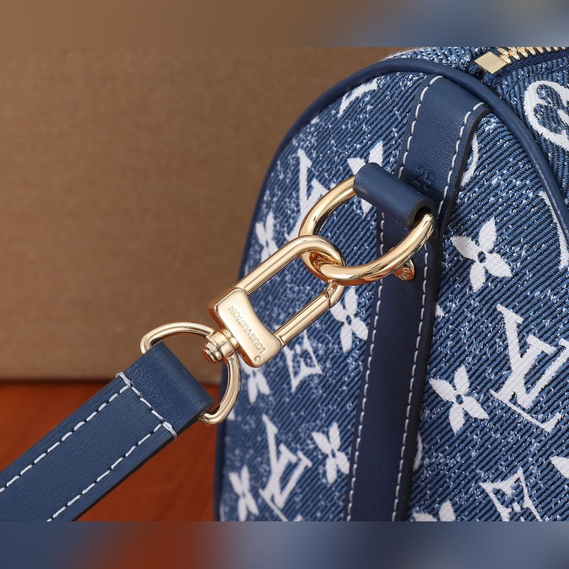LV 스피디 밴두리 25 핸드백 모노그램 자카드 데님과 소가죽 트림으로