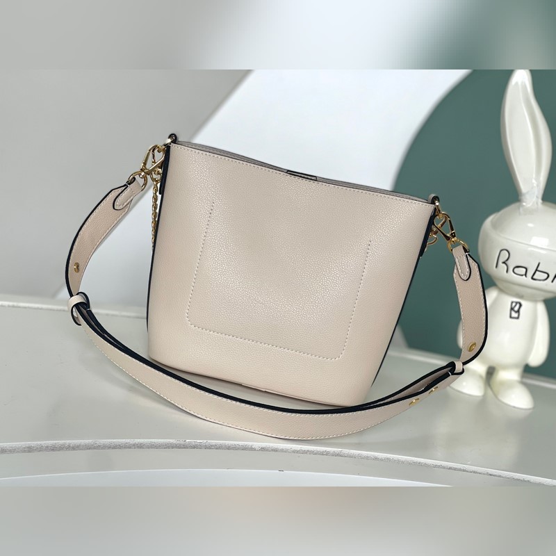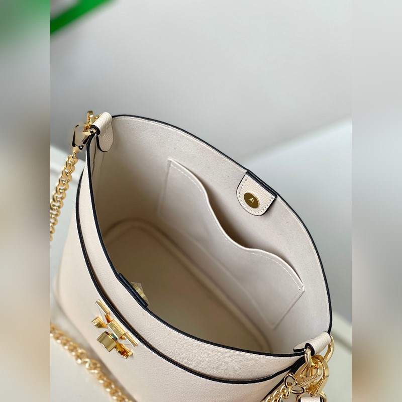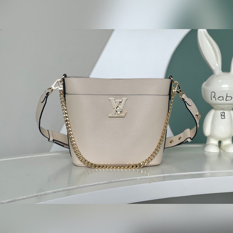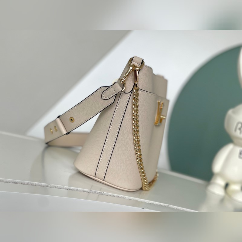 [원본 단일 실제 가족 사진] 풀 레더 버킷 백 체인 백 시리즈 락 앤 워크 핸드백 M24006 블랙 M24638 화이트 M24165 브라운 그레인 송아지 가죽으로 만든 세련된 버킷 백. 가볍고 편안하게 휴대할 수 있는 이 가방은 캐주얼한 편안함과 파리지앵의 세련됨을 결합했습니다. LV 턴락으로 고정된 큰 앞쪽 수납공간을 통해 필수품을 쉽게 꺼낼 수 있습니다. 탈착식 스마트 스트랩과 골드 컬러 체인 핸들을 통해 다양한 휴대 스타일을 제공합니다. 크기 20 x 20.5 x 12cm.