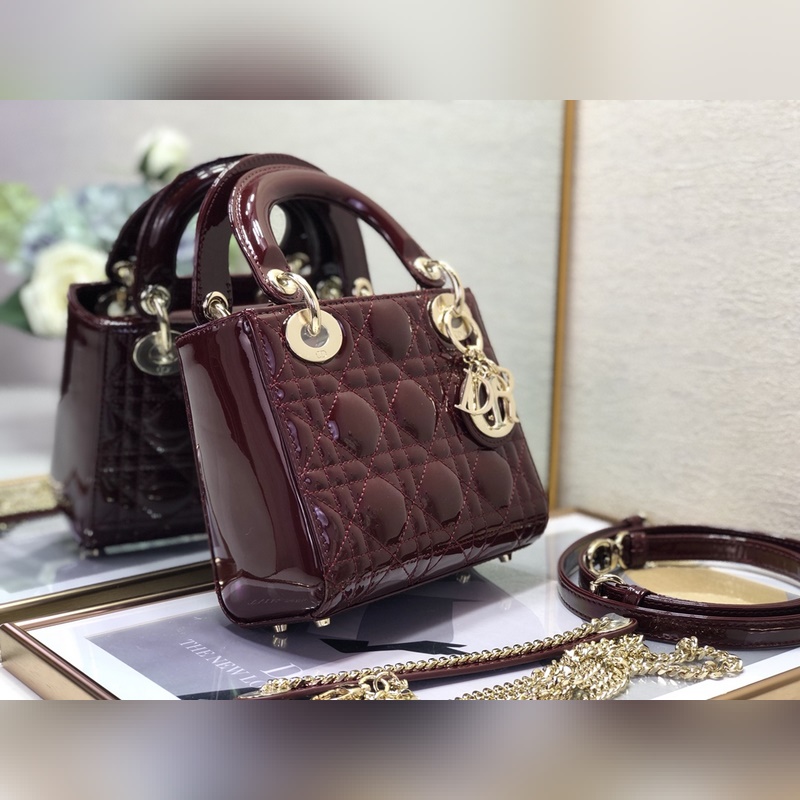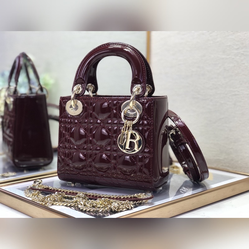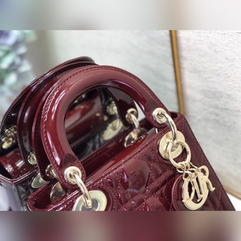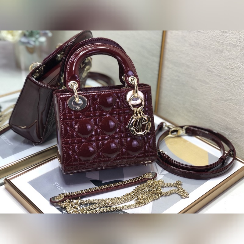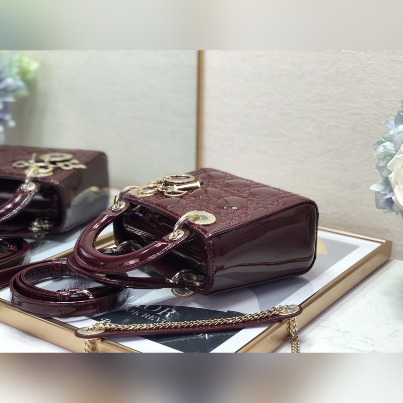Dior 3구 버건디색 특허 가죽에 금색 하드웨어 Lady Dior Mi