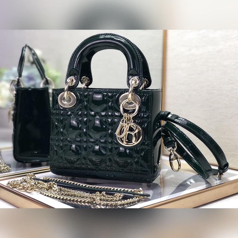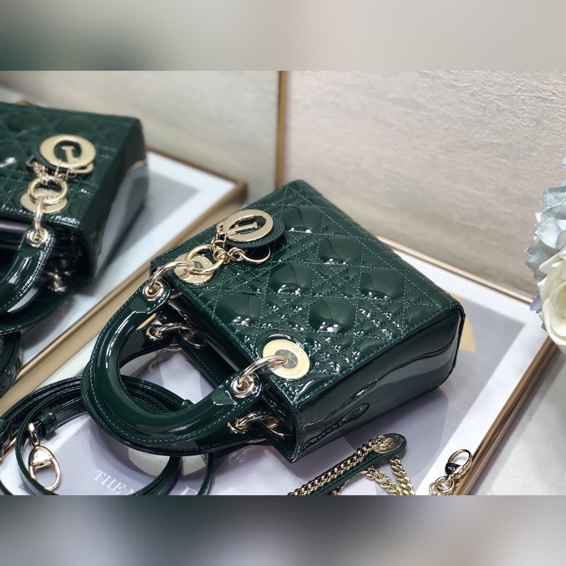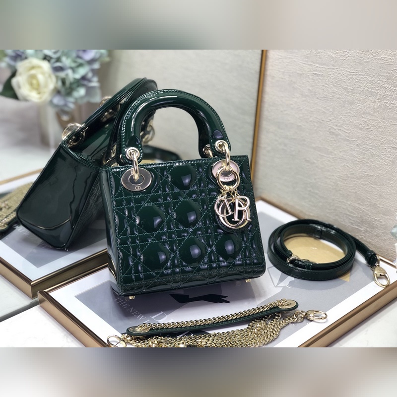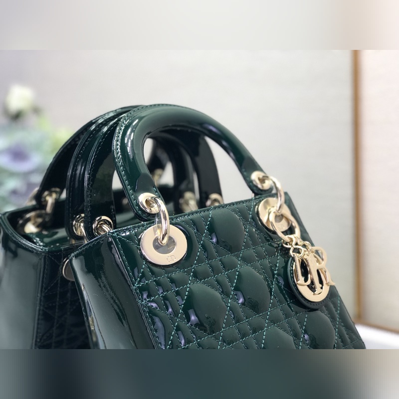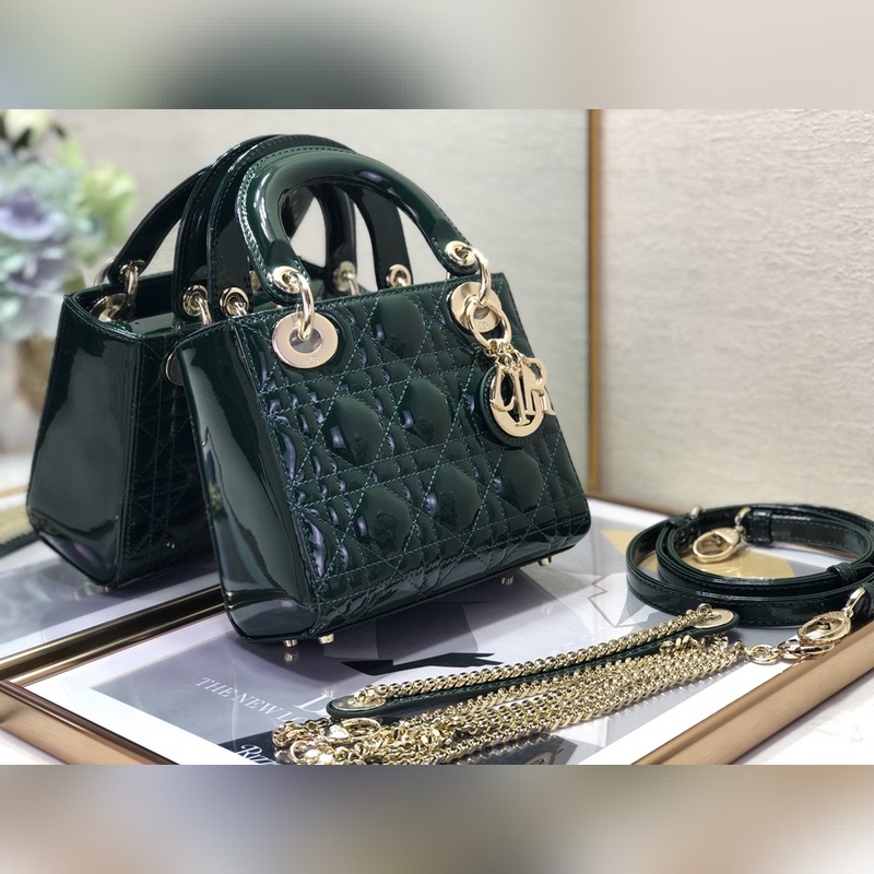 Dior 3칸 수납공간이 있는 잉크 그린색의 특허 가죽에 골드톤 하드웨어