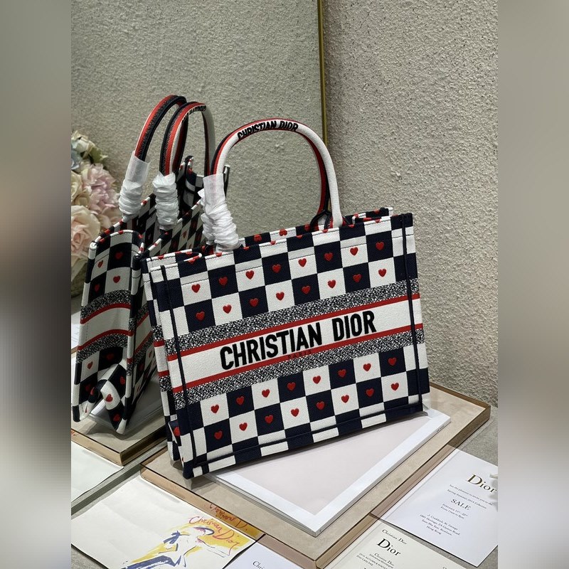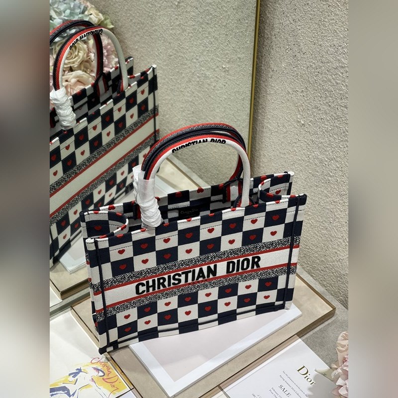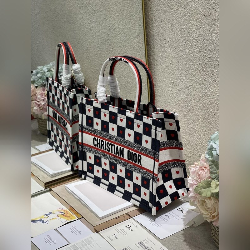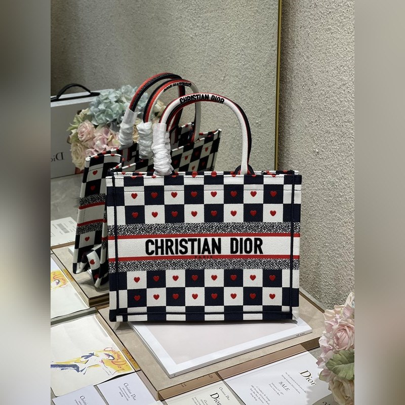 디올 북 토트백 쇼핑백 검은색과 흰색의 체크무늬 하트 패턴 No.: M