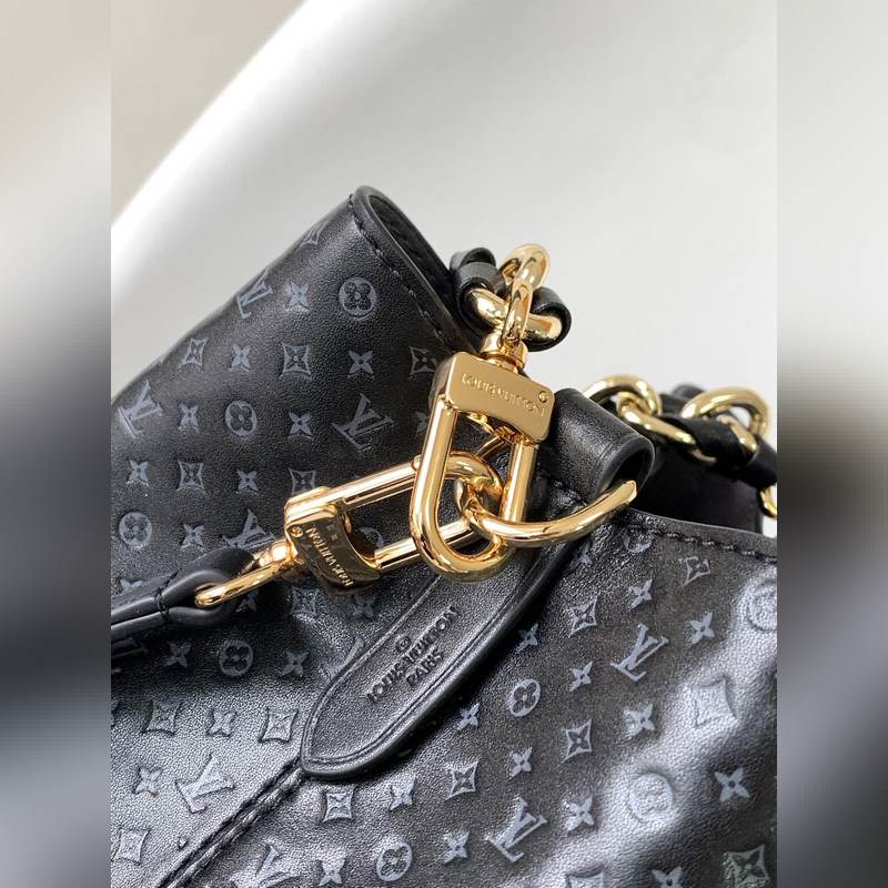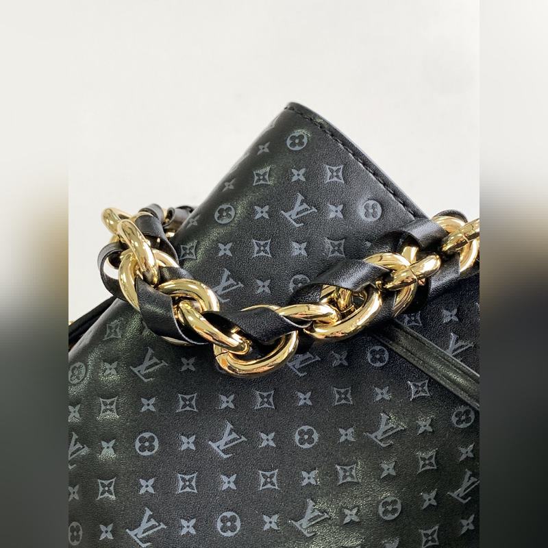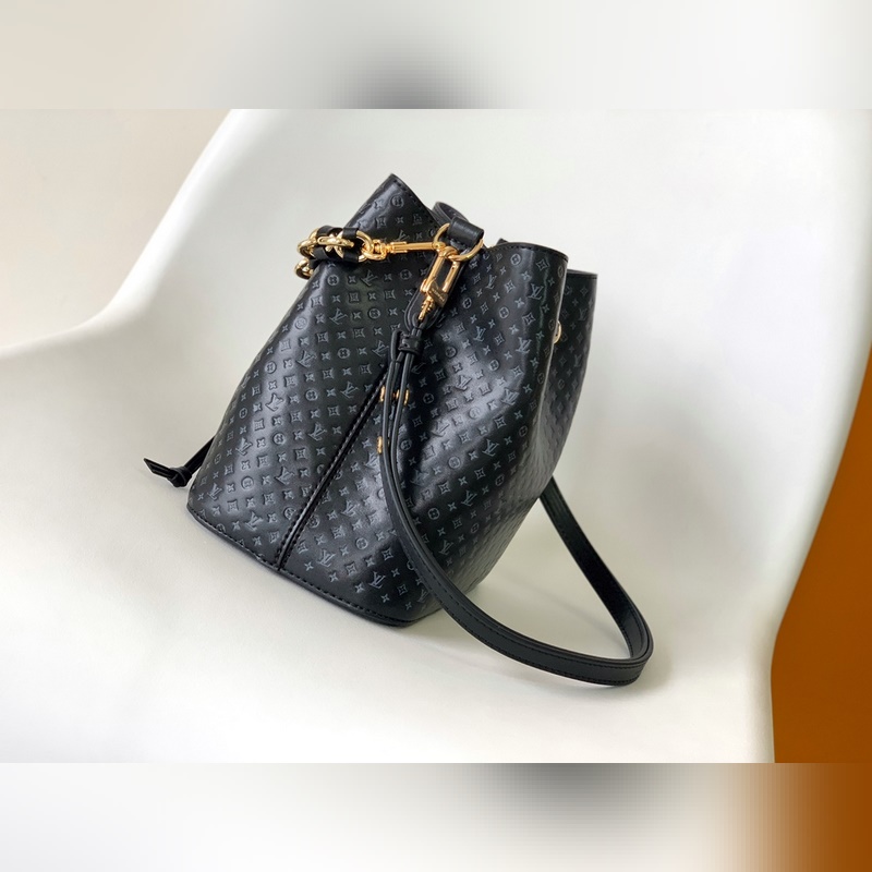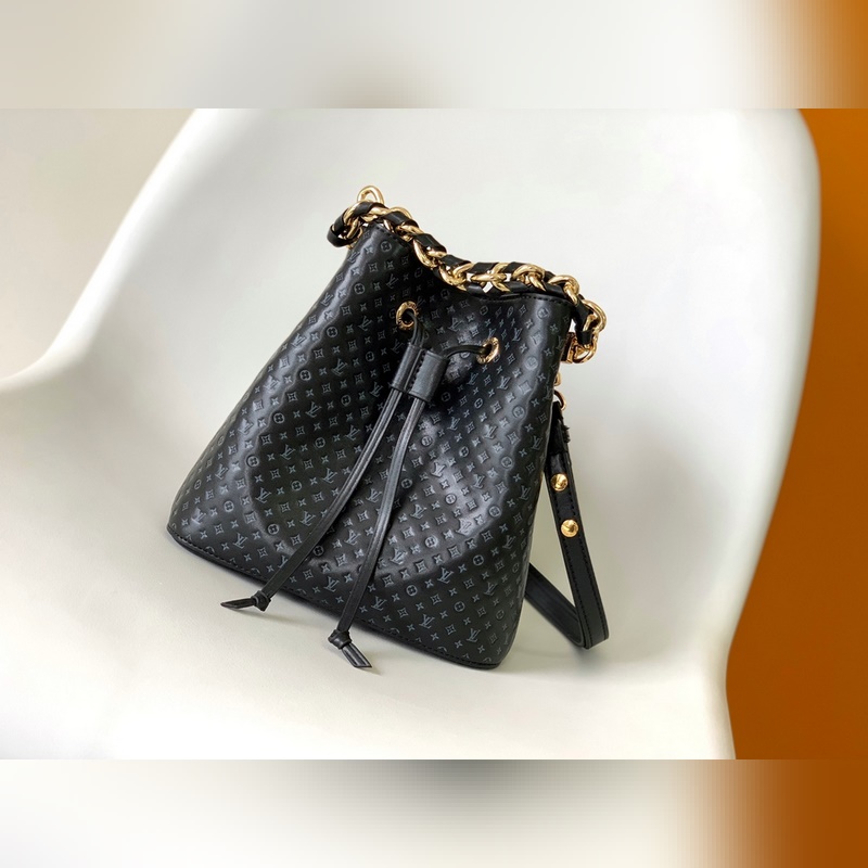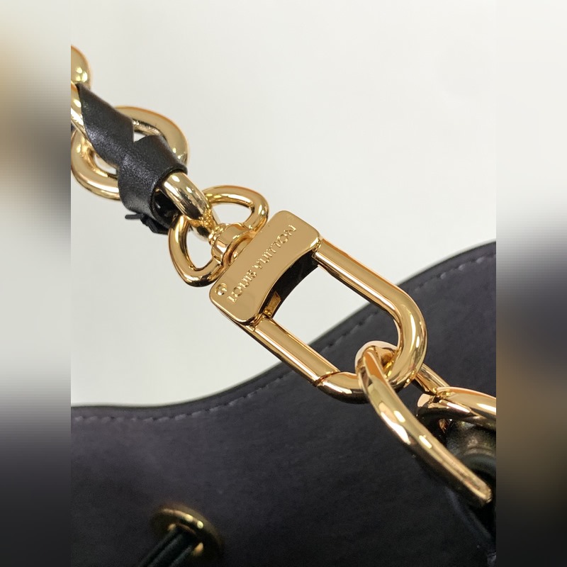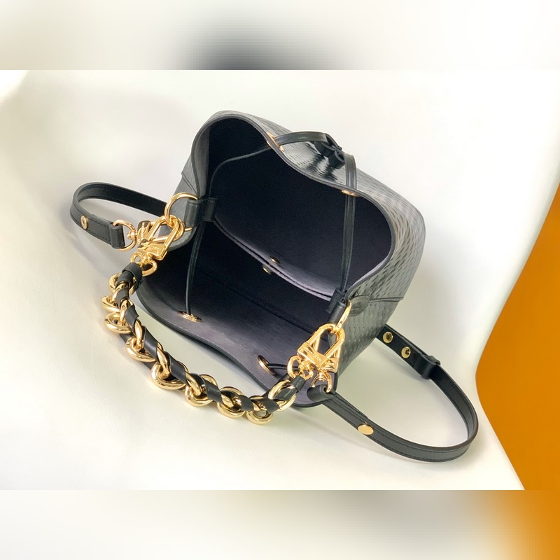 M22598 검정 M22599 노랑 최고급 오리지널 네오노에 BB 버킷백 부드러운 소가죽 소재 나노 모노그램 엠보싱 미니 LV 로고와 모노그램 플라워 패턴이 부드러운 색상 대비를 이룹니다. 어깨 체인과 가죽 어깨 스트랩에 가방과 같은 색상의 브레이드 가죽 요소가 사용되었습니다. 내부 20 x 20 x 13cm