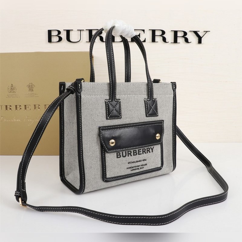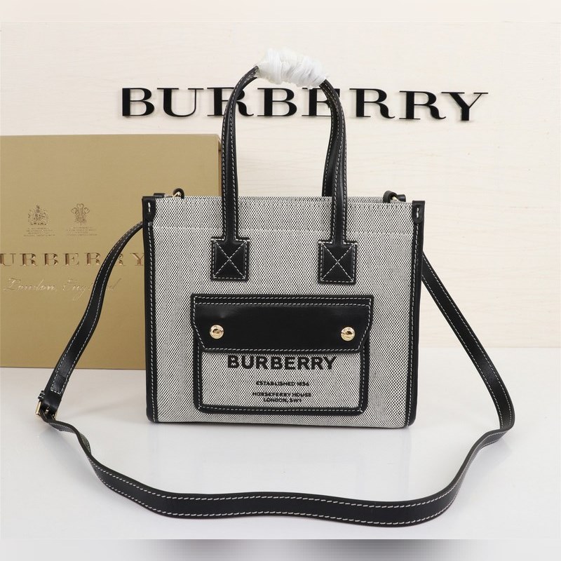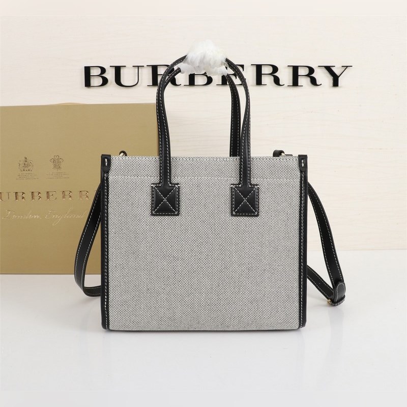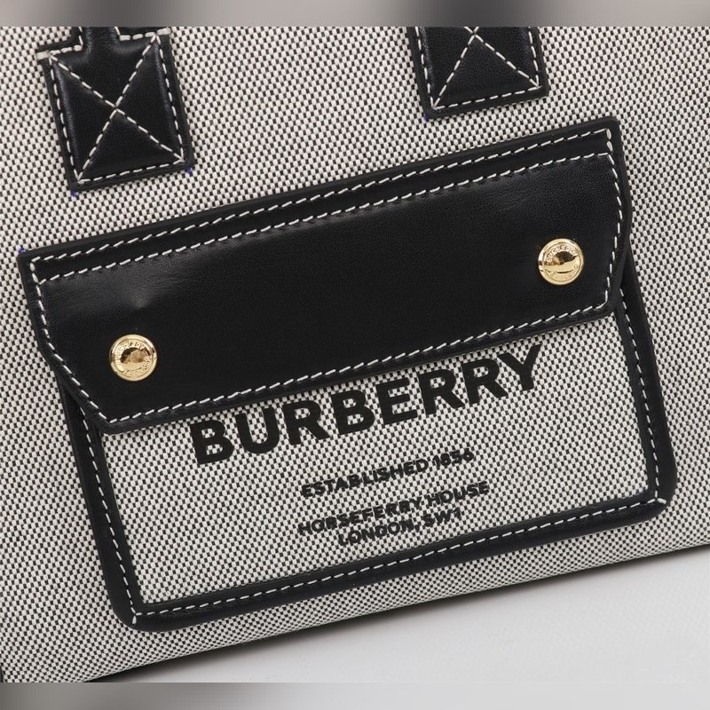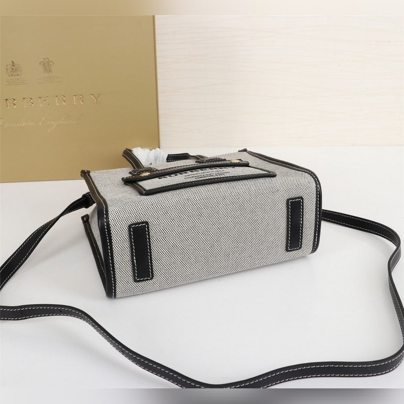 버버리 뉴 미니 투톤 캔버스 앤 레더 토트백 톱 스티치로 마감한 가죽과