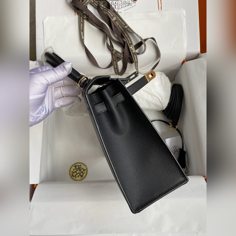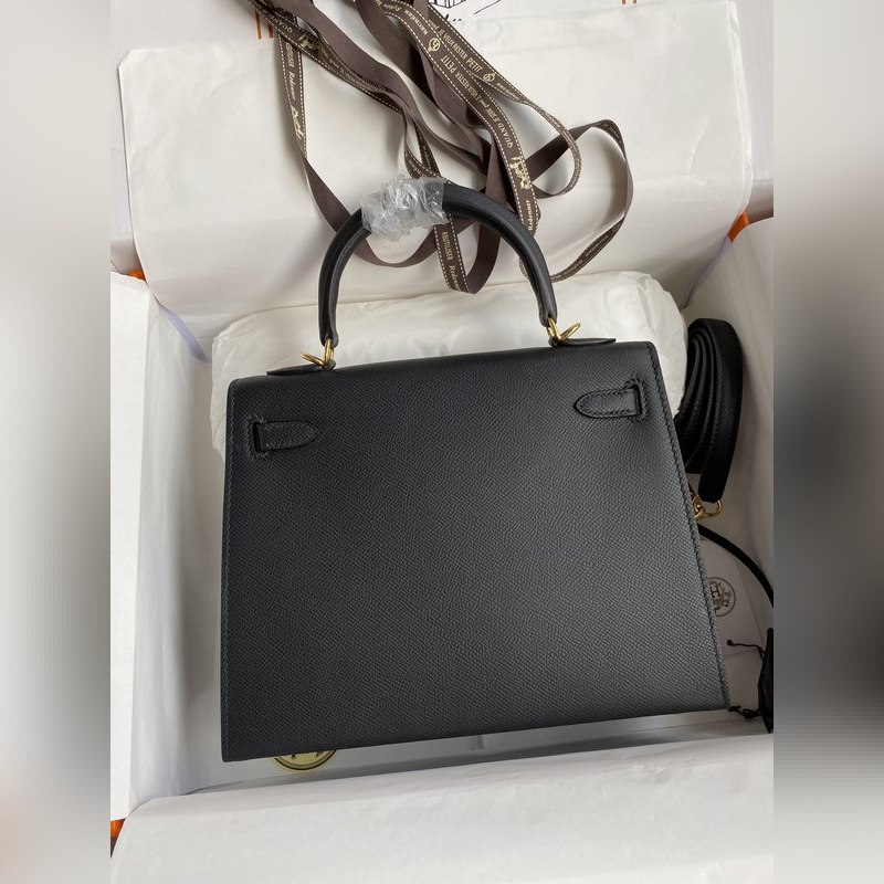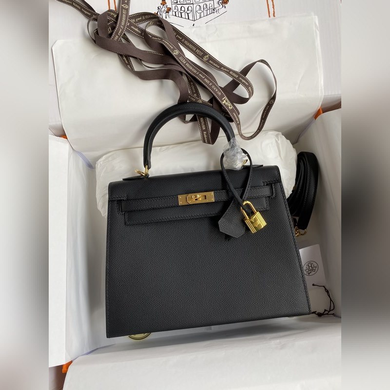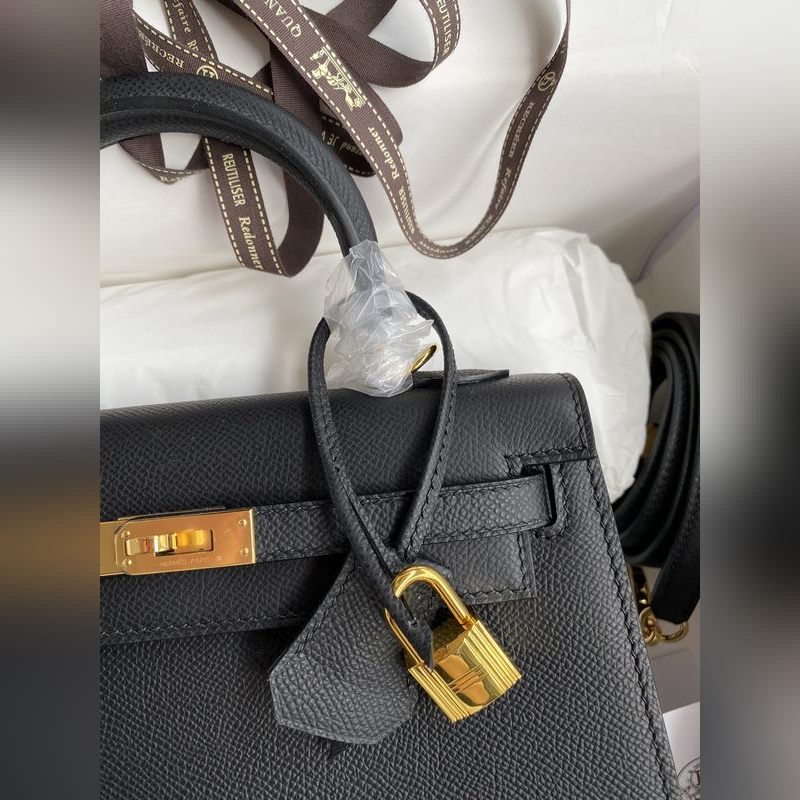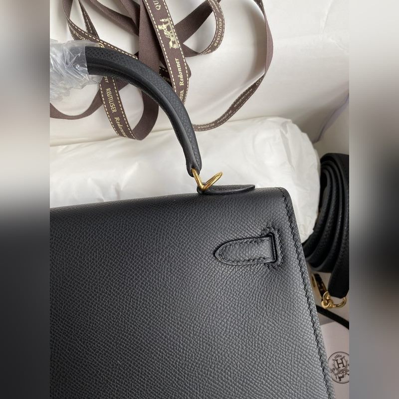 에르메스 켈리 백 왁스 처리된 스티치로 완전히 마감된 에프솜 가죽 블랙