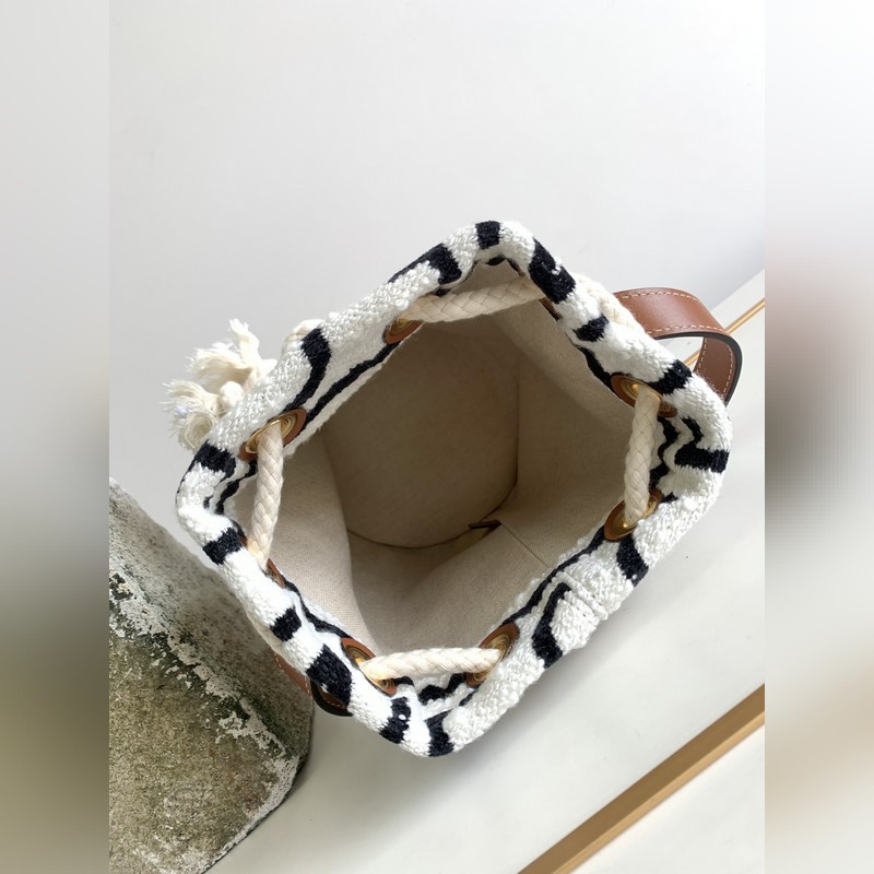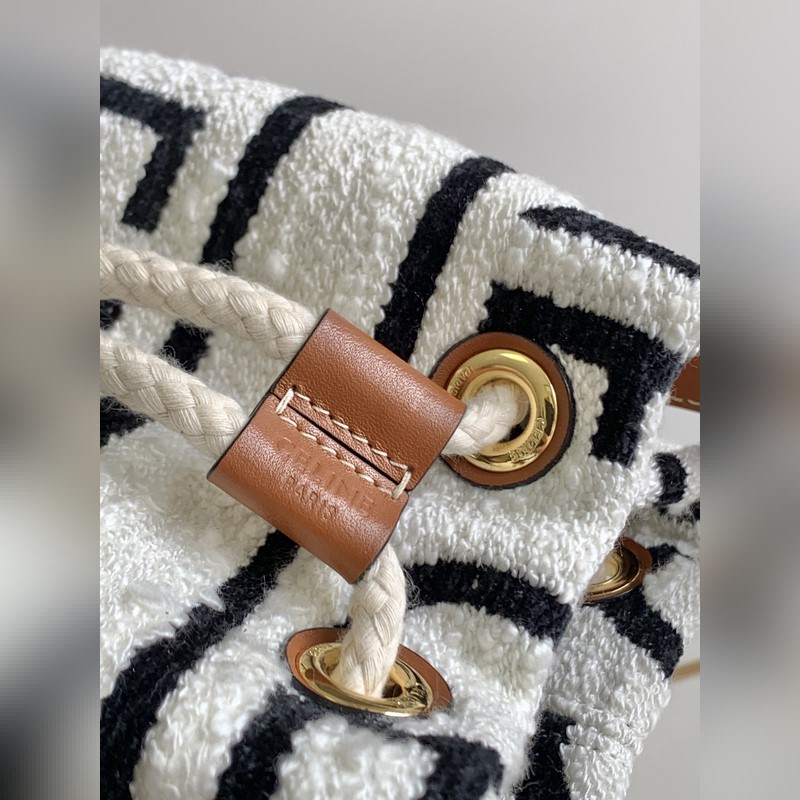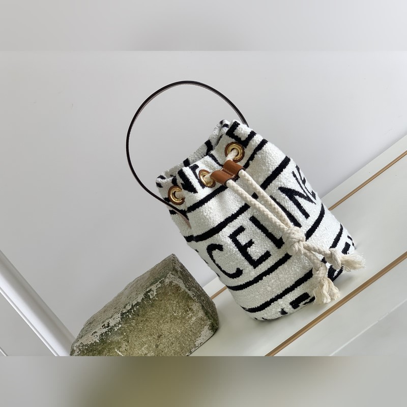22s 신상 TEEN CELINE 올오버 프린트 직물 소가죽 드로스트링 백 검은색과 흰색 글자가 적힌 작은 버킷백과 끈. 귀엽고 실용적인 것을 원한다면 작은 버킷백이 제격입니다. 실용성과 아름다움을 겸비한 귀여운 작은 가방. 복고풍이고 다용도. 수납 용량: 휴대폰 지갑 선글라스 작은 우산 헤드폰 기타 등등… 여성이 일상생활에서 가지고 다니는 모든 물건을 수납할 수 있습니다. 천/소가죽 천 안감 휴대용 끈으로 조임 가죽 손잡이 길이 13cm 크기: 15 x 19 x 15cm 아이템 번호: 196532EFY.01WB