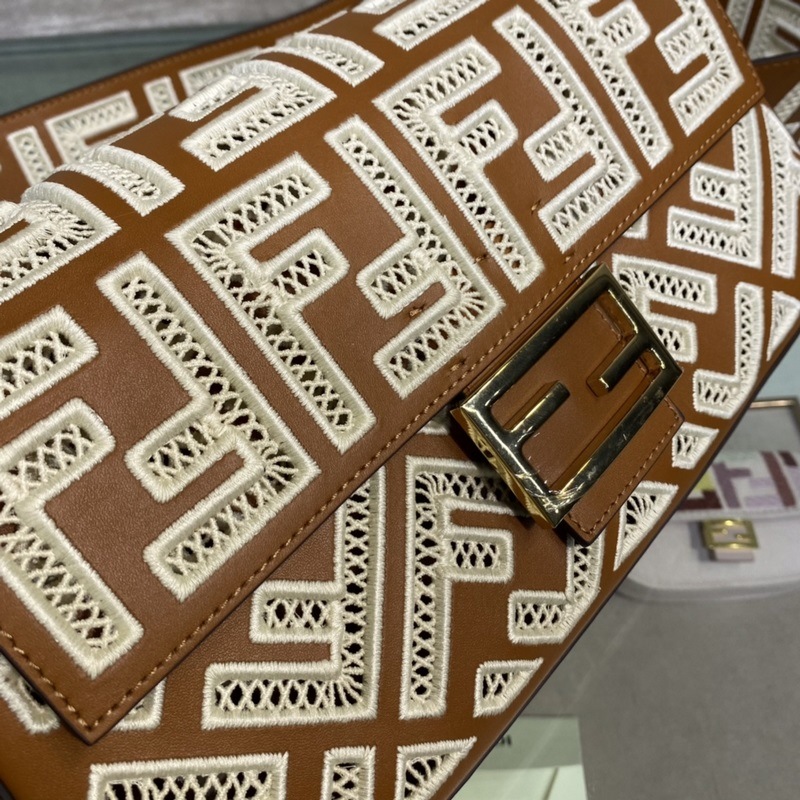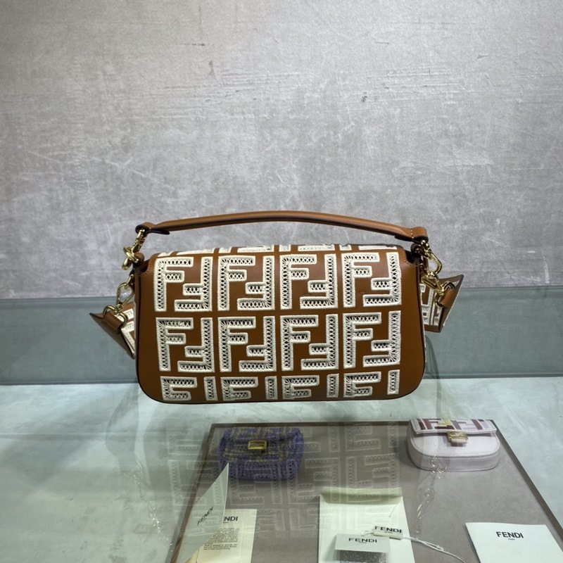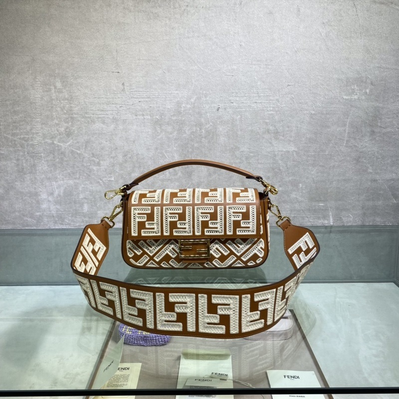 FENDI 아이코닉 바게트 미디엄 핸드백 갈색 가죽 화이트 FF 패턴 자