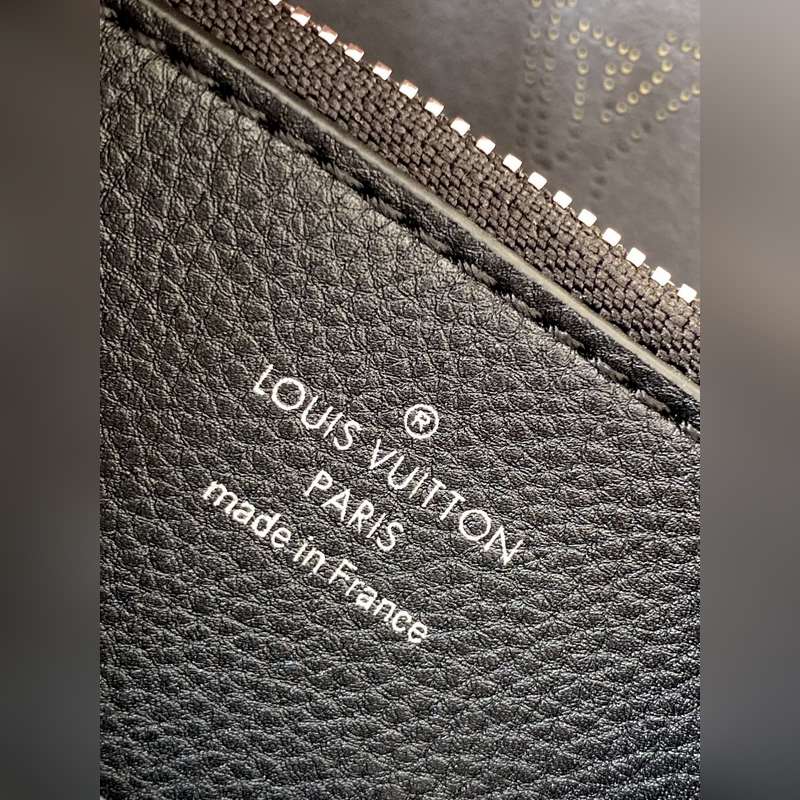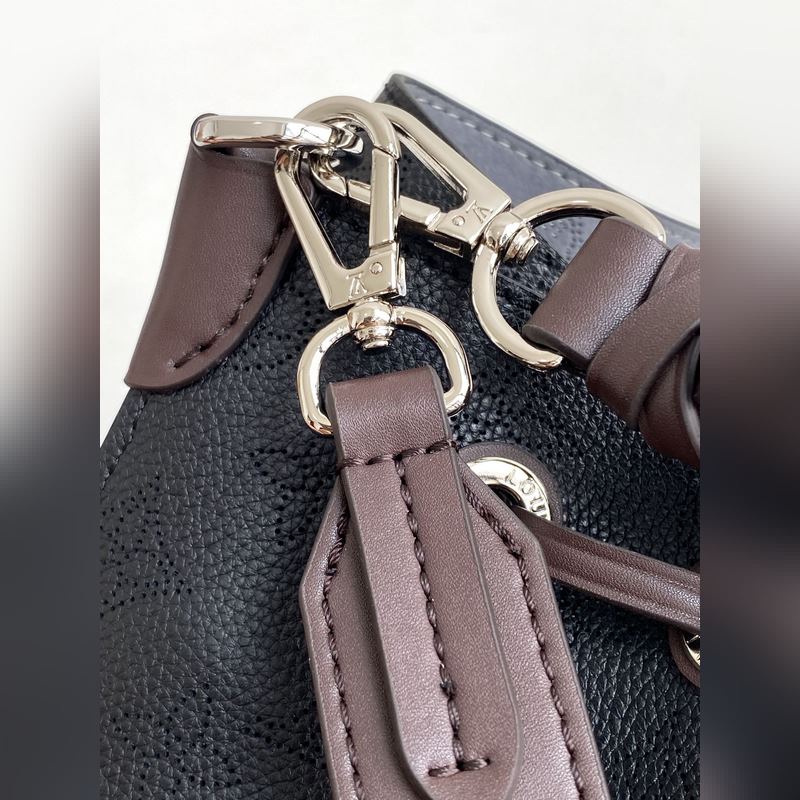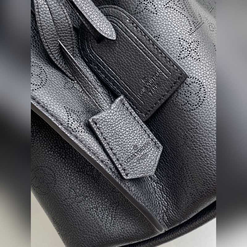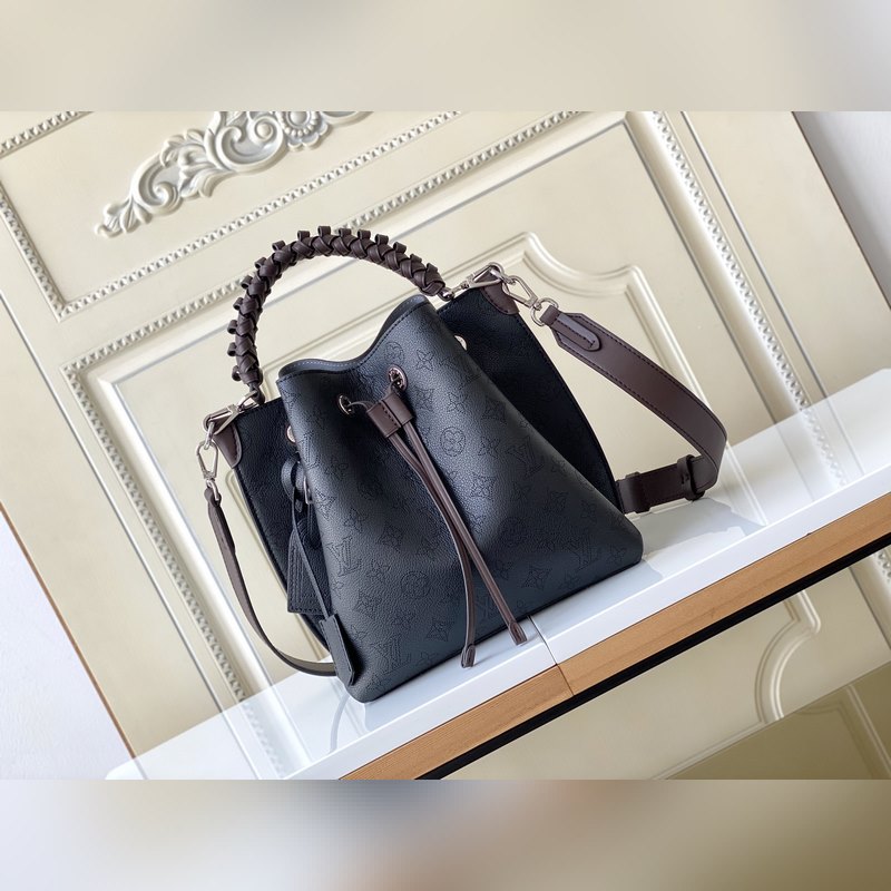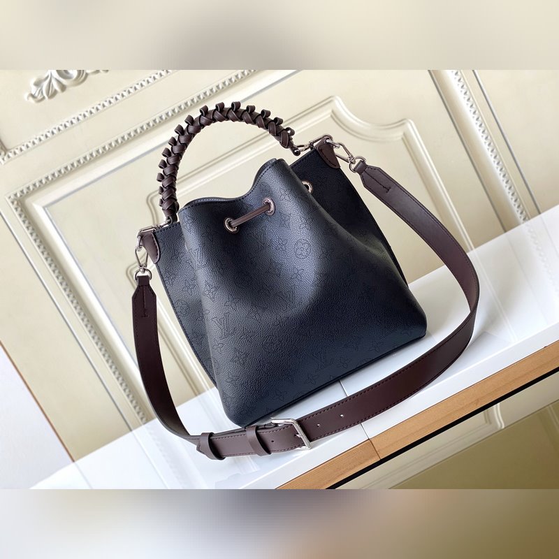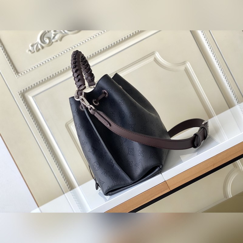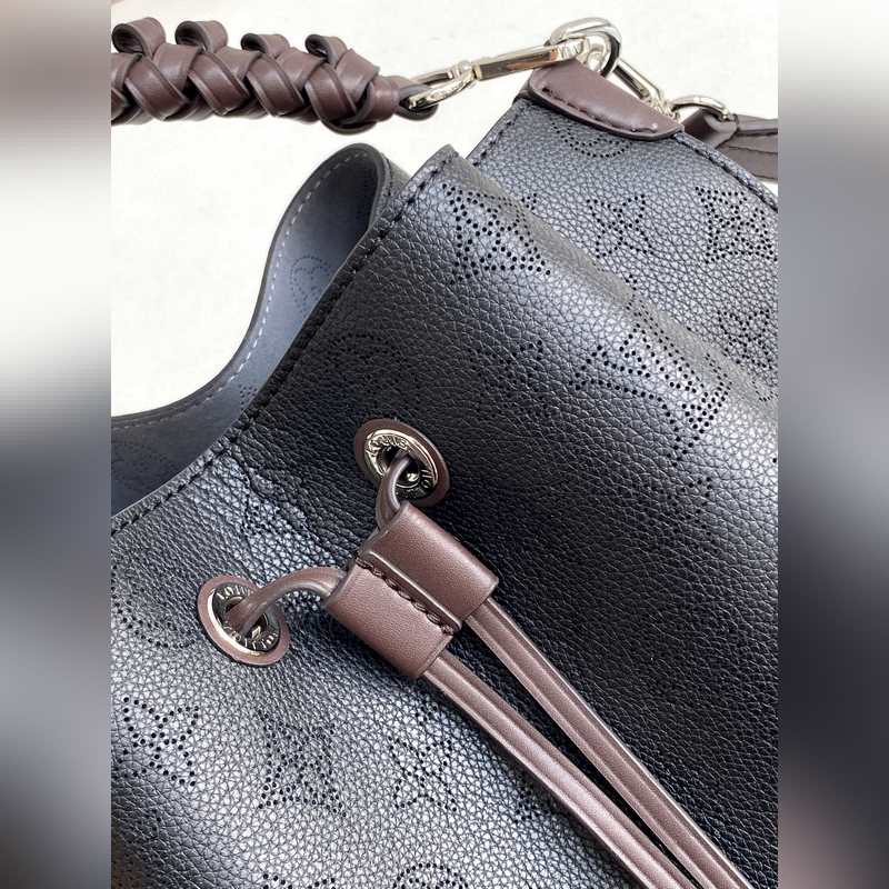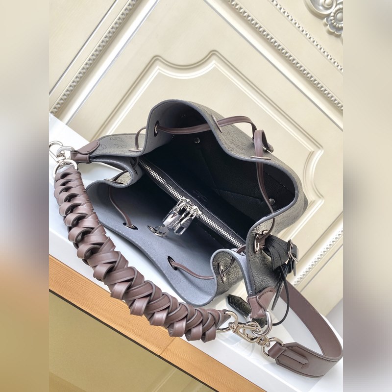 [원작 Haiwan Single Real Home Shot] M55799 아몬드 55800 블랙 55801 화이트 버트 라곤 무리아 버킷 백은 펀칭 처리된 송아지 가죽으로 만들어졌으며 모노그램 패턴 이름표 열쇠고리가 달려 있습니다. 직조된 손잡이와 긴 가죽 어깨끈이 달려 있습니다. 25×25×20cm 0418650