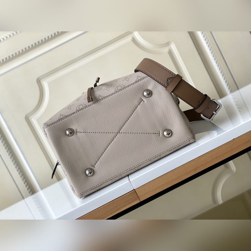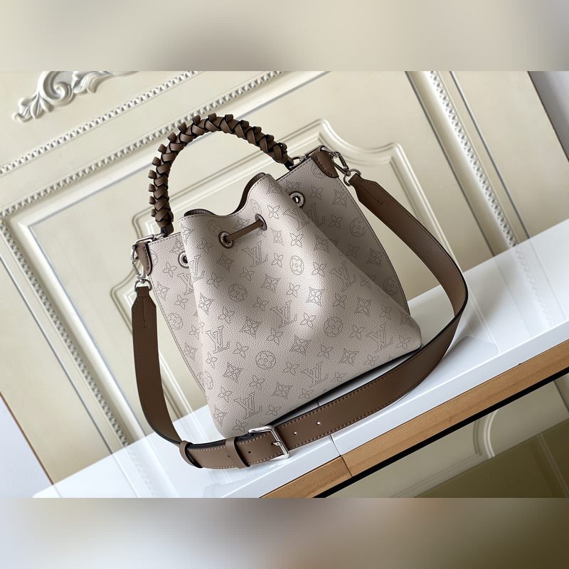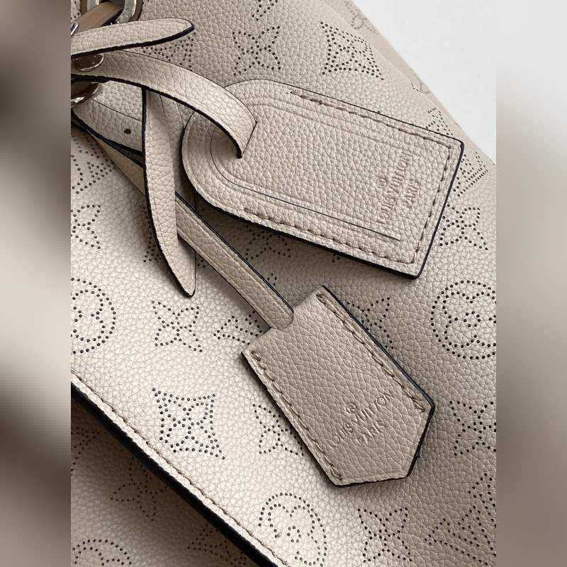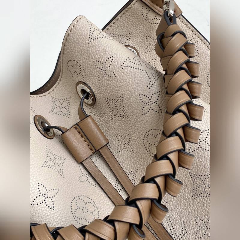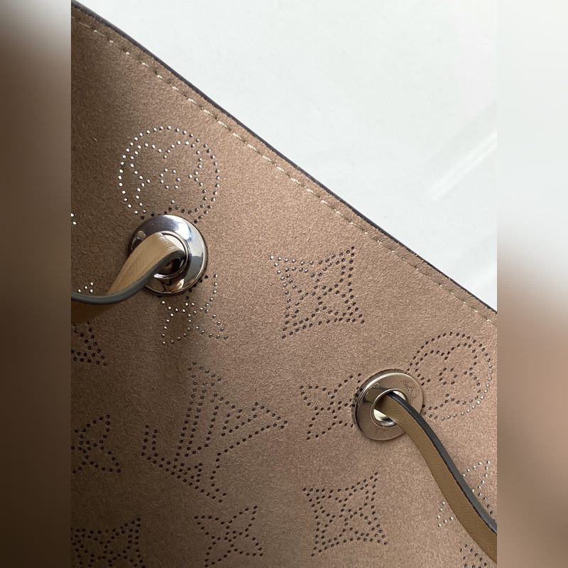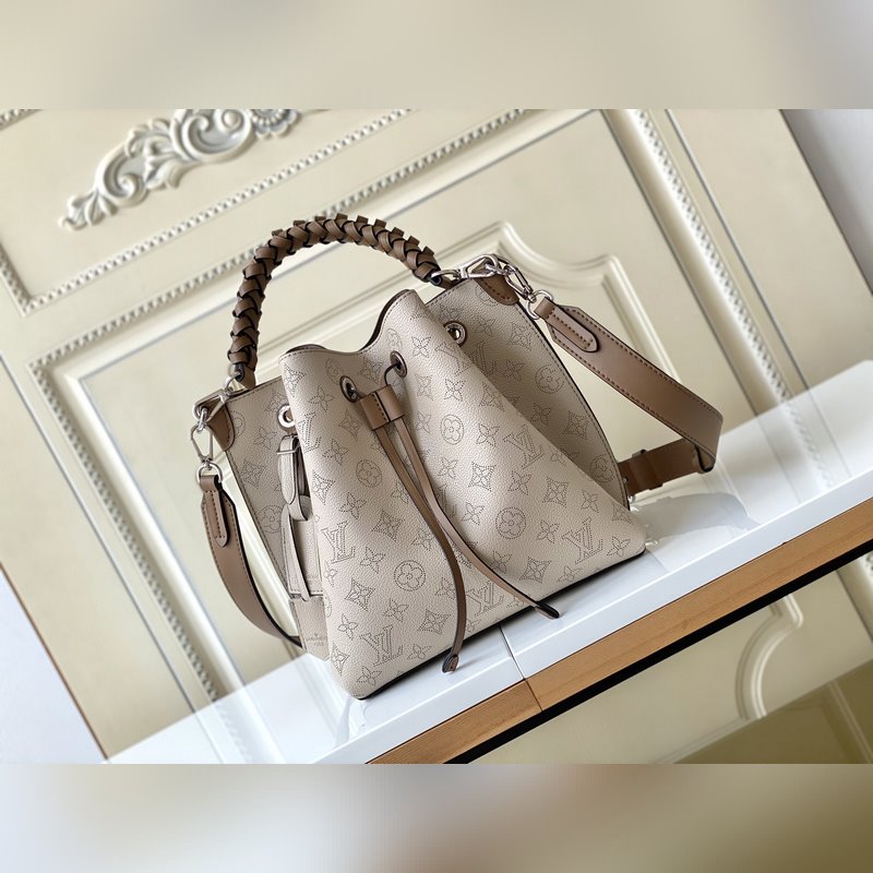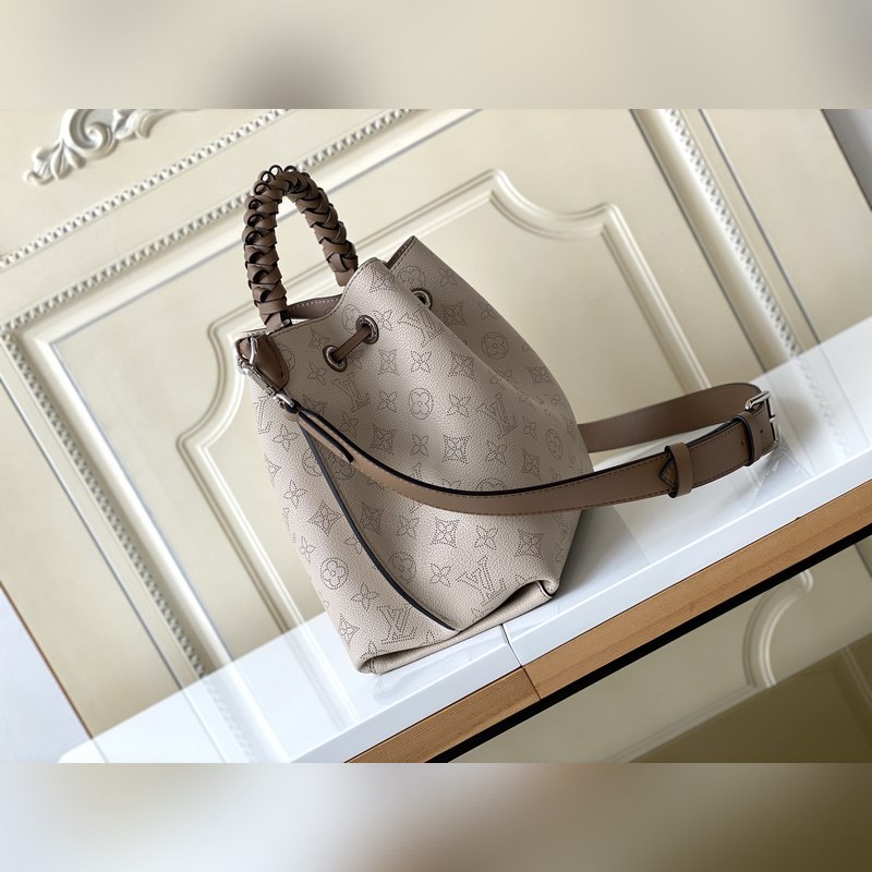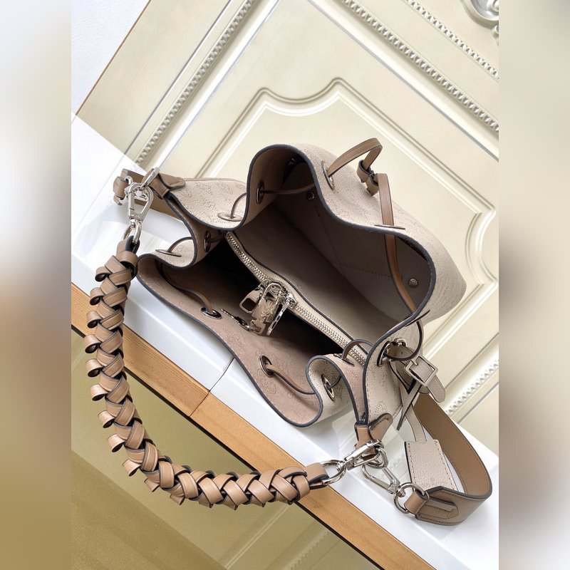 [원래 해운 단독주택 매매] M55799 아몬드 55800 블랙 55801 화이트 58789 핑크 베르 라곤 무리아 버킷 백 모노그램 패턴이 있는 펀칭 송아지 가죽 소재 이름표와 열쇠고리가 장식되어 있습니다. 직조된 손잡이와 긴 가죽 어깨 스트랩이 있습니다. 25×25×20cm 0418650