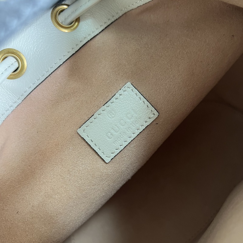 GG 미니 버킷백은 두 가지 눈에 띄는 브랜드 요소인 대나무 손잡이와 더블 G 액세서리를 결합한 제품입니다. 화이트 가죽 소재가죽 트림과 대비를 이루며 생동감 있고 우아한 분위기를 강조합니다. 화이트 가죽 사진에 표시된 대로 이 제품은 더블 G가 있는 장식용 가죽 손잡이 1개 길이 조절이 가능한 어깨 스트랩 내부 오픈 포켓 대나무 손잡이(높이 8cm)가 함께 제공됩니다. 아이템 번호 724667. 소형 사이즈: 19(가로) x 30.5(세로) x 6(깊이) 색상: 흰색/원래 가죽. 품번: XP96181130