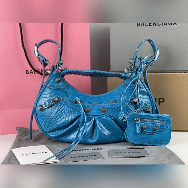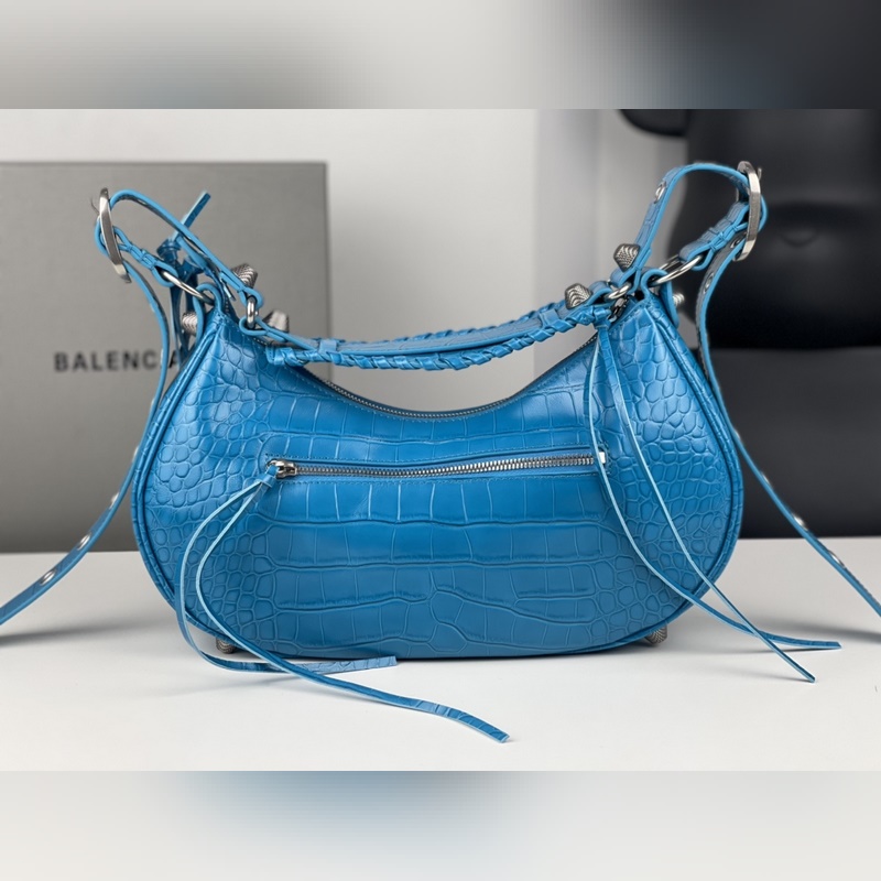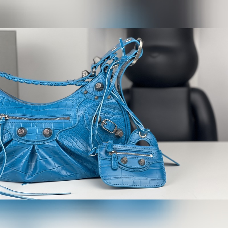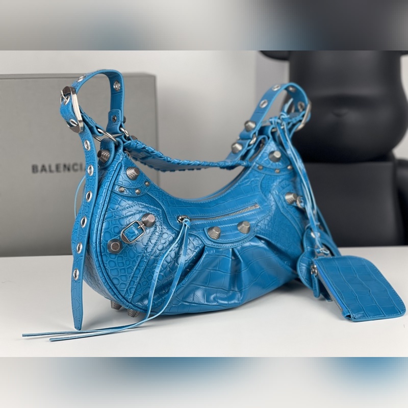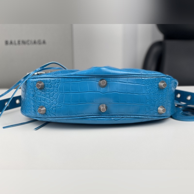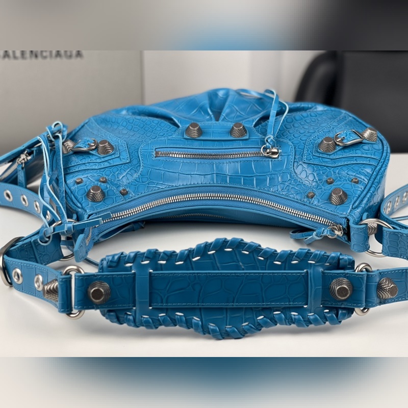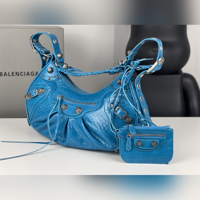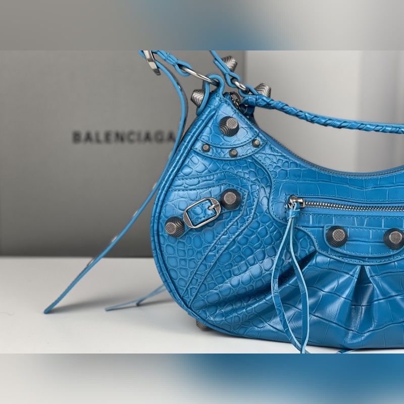 발렌시아가의 르 카골(Le Cagole) 스몰 숄더백은 클래식 모터사이클 라인의 헤리티지를 현대적으로 재해석한 디자인입니다. 조절 가능한 짜임 어깨 끈과 추가적인 메탈 홀 외부 가죽 카드 홀더가 더해져 실용적이면서도 독창적인 스타일을 완성합니다. 하트 모양의 미러 참은 발렌시아가의 상징적인 오토바이 감성에 대한 오마주로 대담하고 자유로운 록 시크 무드를 표현합니다. 정교한 디테일과 빈티지한 하드웨어가 조화를 이루며 모델번호는 BLSJ96181250 사이즈는 약 33 × 16 × 8cm입니다.