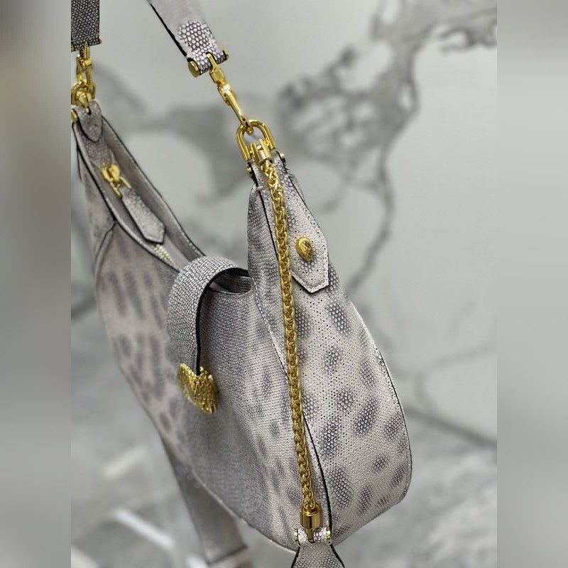 불가리 세르펜티 엘립스 시리즈 대형 크로스바디 백 언더암 백 모델 번호: 291636 독특한 모양 상징적인 디테일 다재다능한 매력으로 SERPENTI FOREVER 세계에 세련된 느낌을 더해줍니다. 이 데일리 백은 은색 송아지 가죽으로 만들어졌으며 측면에 뱀 비늘 무늬가 있고 금도금 황동 액세서리가 달려 있습니다. 매력적인 클래식 뱀 머리는 은색 비늘과 분홍색 에나멜 눈으로 장식되어 있으며 자석으로 고정되는 앞면 버튼으로 가려져 있습니다. 단일 수납공간 길이 조절이 가능한 체인 가죽 숄더 스트랩 탈부착이 가능한 가죽 손잡이가 달려 있어 크로스바디 백 또는 클래식한 숄더백으로 착용할 수 있습니다. 실용적인 상단 지퍼 여밈 방식의 이 가방에는 내부 포켓 뒷면에 외부 포켓 BVLGARI 금속 로고가 달려 있습니다. 크기: 25.5 x 25 x 5.5 cm