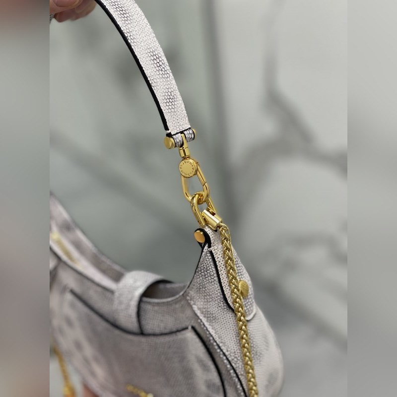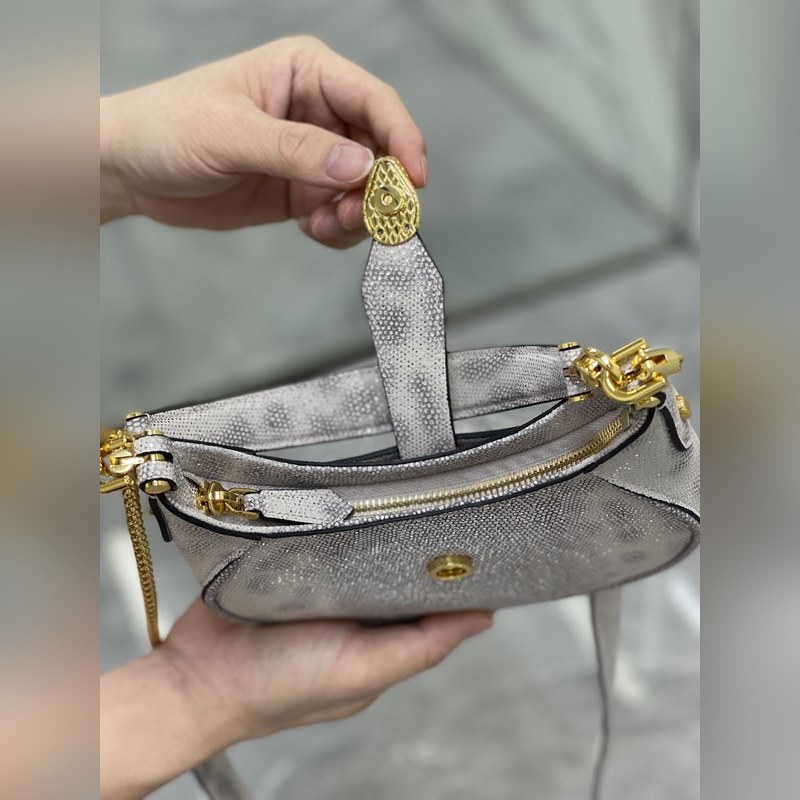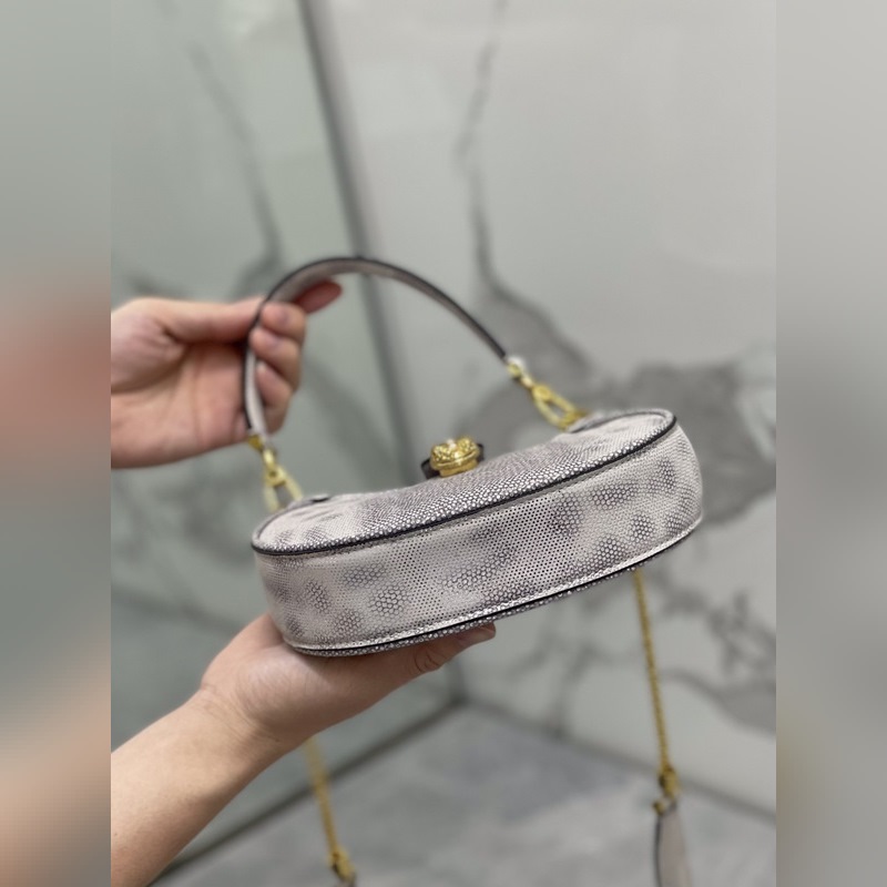 불가리 세르펜티 엘립스 시리즈 스몰 크로스바디 백 언더암 백 모델 번호: 291765 독특한 모양 상징적인 디테일 다재다능한 매력으로 SERPENTI FOREVER 세계에 세련된 느낌을 더해줍니다. 이 데일리 백은 은색 송아지 가죽으로 만들어졌으며 측면에 뱀 비늘 무늬가 있고 금도금 황동 액세서리가 달려 있습니다. 매력적인 클래식 뱀 머리는 은색 비늘과 분홍색 에나멜 눈으로 장식되어 있으며 자석으로 고정되는 앞면 버튼으로 가려져 있습니다. 단일 수납공간 길이 조절이 가능한 체인 가죽 숄더 스트랩 탈착식 가죽 핸들이 있어 크로스바디 백이나 클래식한 숄더백으로 착용할 수 있습니다. 실용적인 상단 지퍼 잠금장치에는 내부 포켓 뒷면에 외부 포켓 BVLGARI 금속 로고가 있습니다. 크기: 19.5 x 20 x 5cm