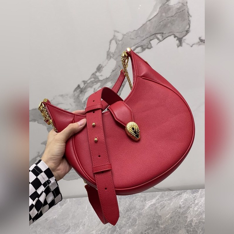 불가리 세르펜티 엘립스 시리즈 스몰 크로스 바디 백 언더암 백 모델: 291636 독특한 모양 상징적인 디테일 다재다능한 매력으로 SERPENTI FOREVER 세계에 세련된 느낌을 더해줍니다. 이 데일리 백은 중앙에 어반 그레인 송아지 가죽 부분이 있고 측면은 부드러운 송아지 가죽으로 제작되었습니다. 금도금 황동 하드웨어 검은 비늘이 있는 매력적인 클래식 뱀 머리 중앙에 빨간색 에나멜 눈이 있고 자석으로 고정되는 앞면 잠금장치로 구성되어 있습니다. 단일 수납공간 길이 조절이 가능한 체인 가죽 숄더 스트랩 탈착식 가죽 손잡이가 있어 크로스 바디 백 또는 클래식한 숄더백으로 착용할 수 있습니다. 실용적인 상단 지퍼 여밈 방식의 이 가방에는 내부 포켓 뒷면에 외부 포켓 BVLGARI 금속 로고가 있습니다. 크기: 25.5 x 25 x 5.5 cm