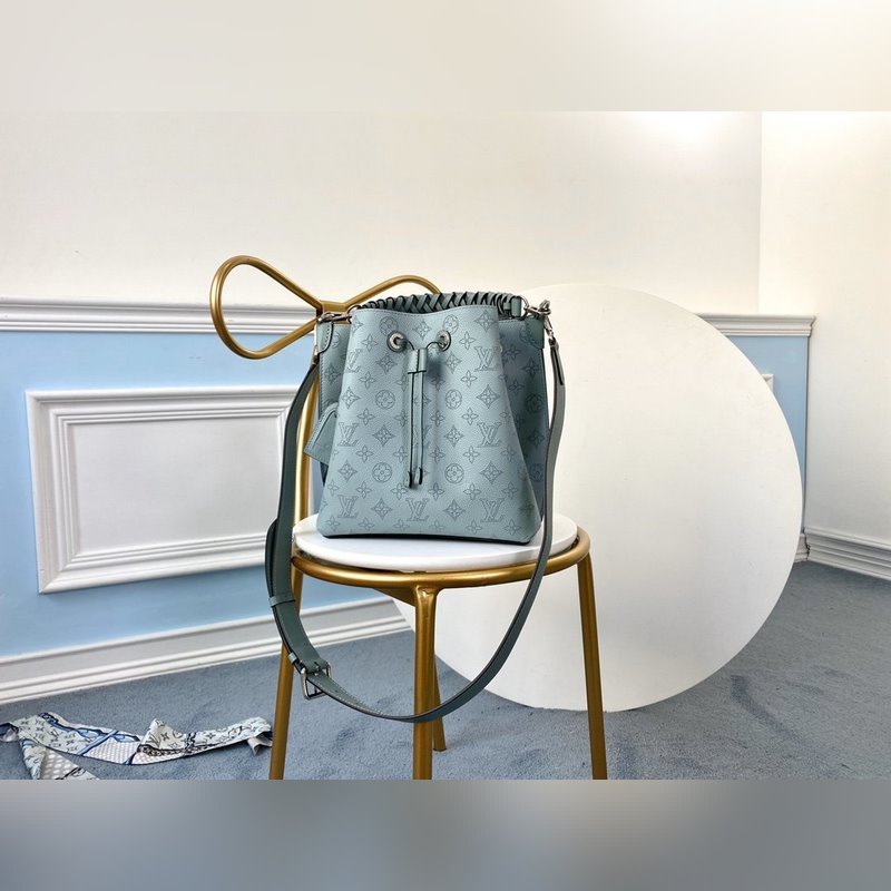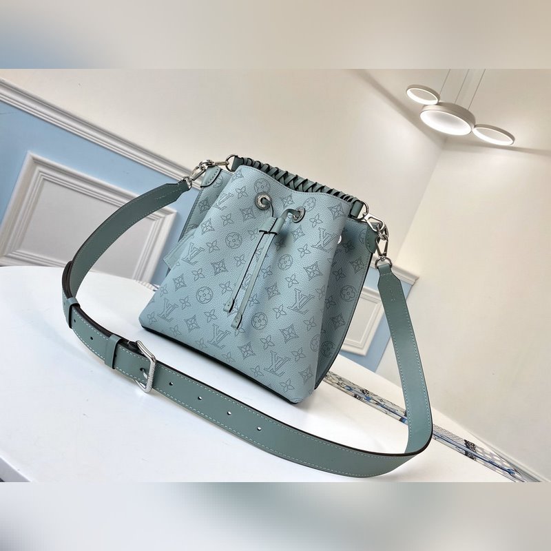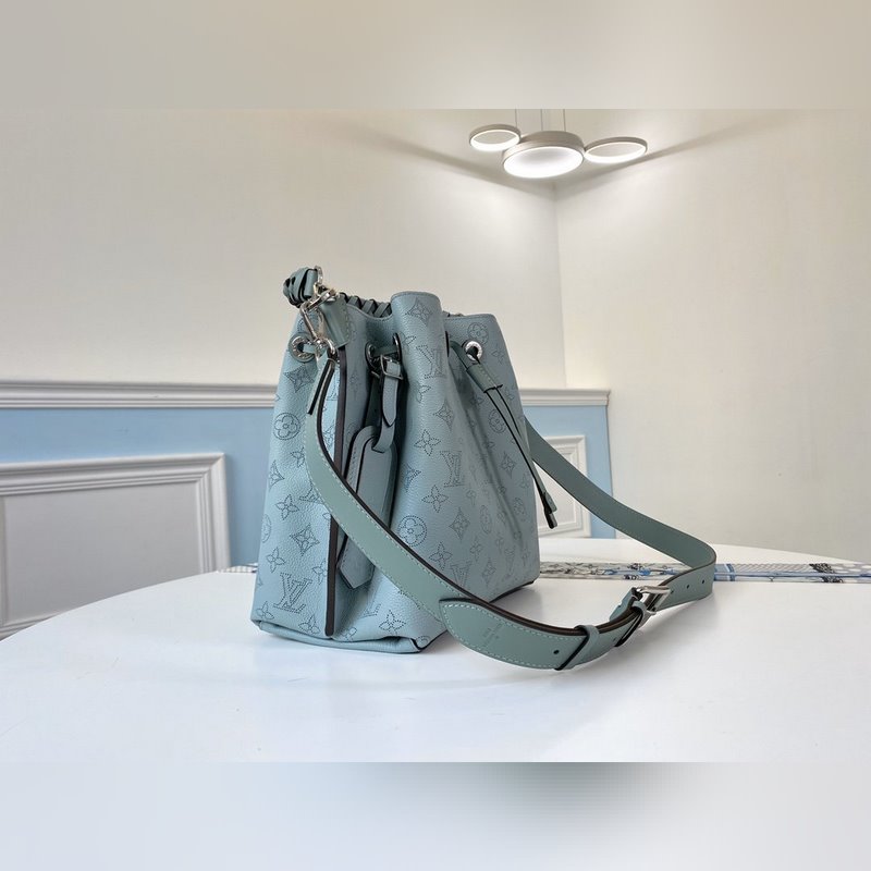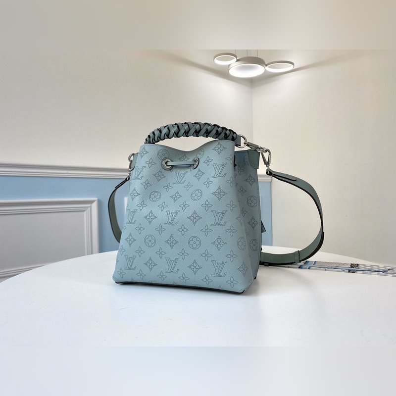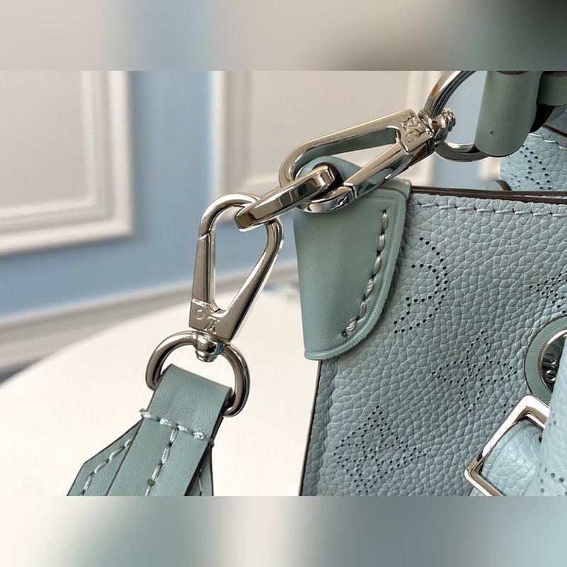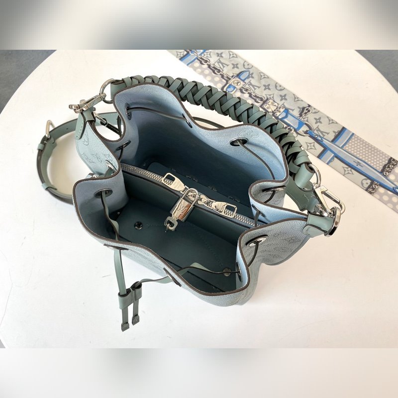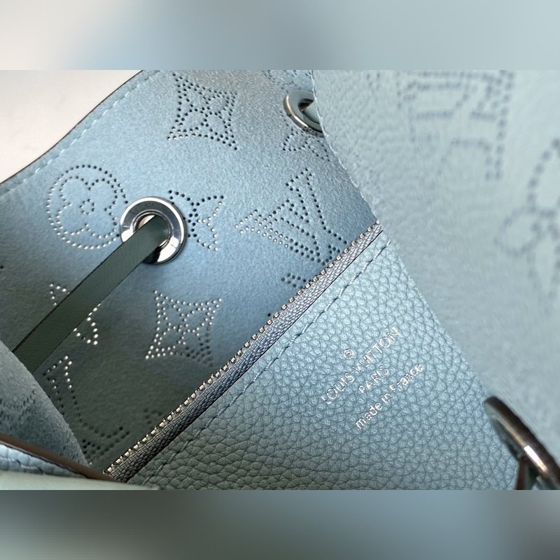 LV 모델 M55906 청록색 블루의 퍼포레이티드 송아지 가죽 무리아 버킷 백 모노그램 모티프가 새겨진 천으로 만든 이름표와 열쇠고리. 직조된 손잡이와 긴 가죽 어깨끈. 크기: 25.0 x 25.0 x 20.0 cm 항목 번호: SG96181460