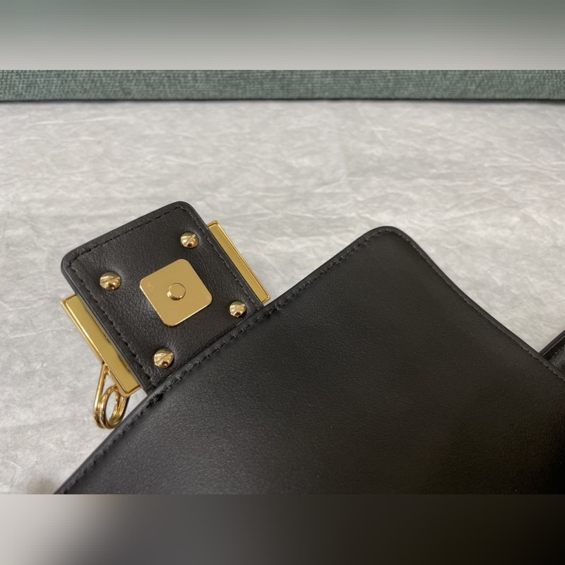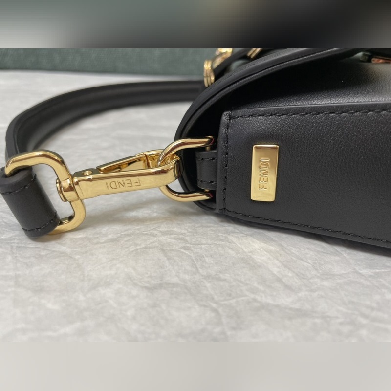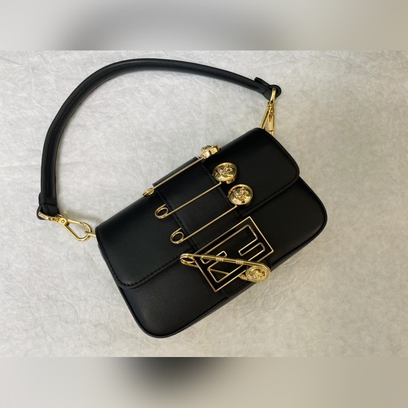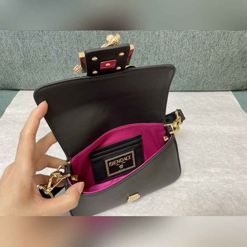 Fandace 시리즈 미니 바게트 언더암 백 모델 8017 Versace by Fendi 1 컬렉션의 상징적인 사각형 바게트 미니 핸드백이 세련된 블랙 부드러운 가죽 버전으로 출시되었습니다. 플랩을 장식하는 세 개의 메두사 금속 핀이 특징입니다. 블랙 플렉시글라스와 핀이 달린 FF 클로저. 자석 걸쇠 내부 포켓과 골드 마감 금속 장식이 있는 내부 주머니가 있는 자홍색 새틴 안감. 팔 아래로 운반할 수 있는 긴 손잡이가 함께 제공됩니다. 크기 20x13x5cm