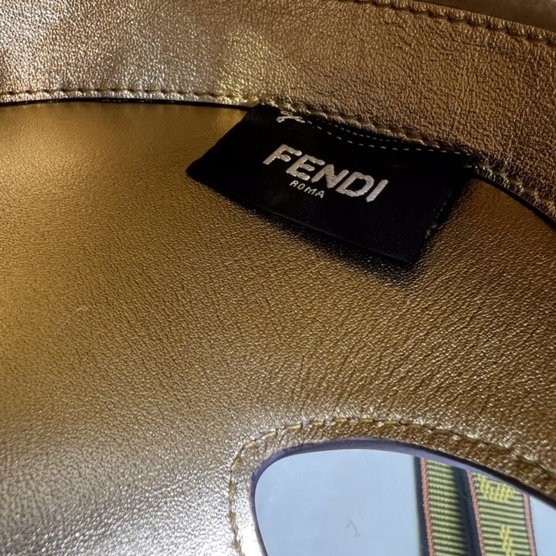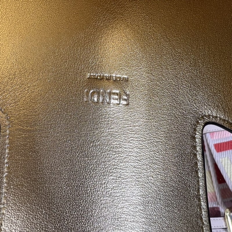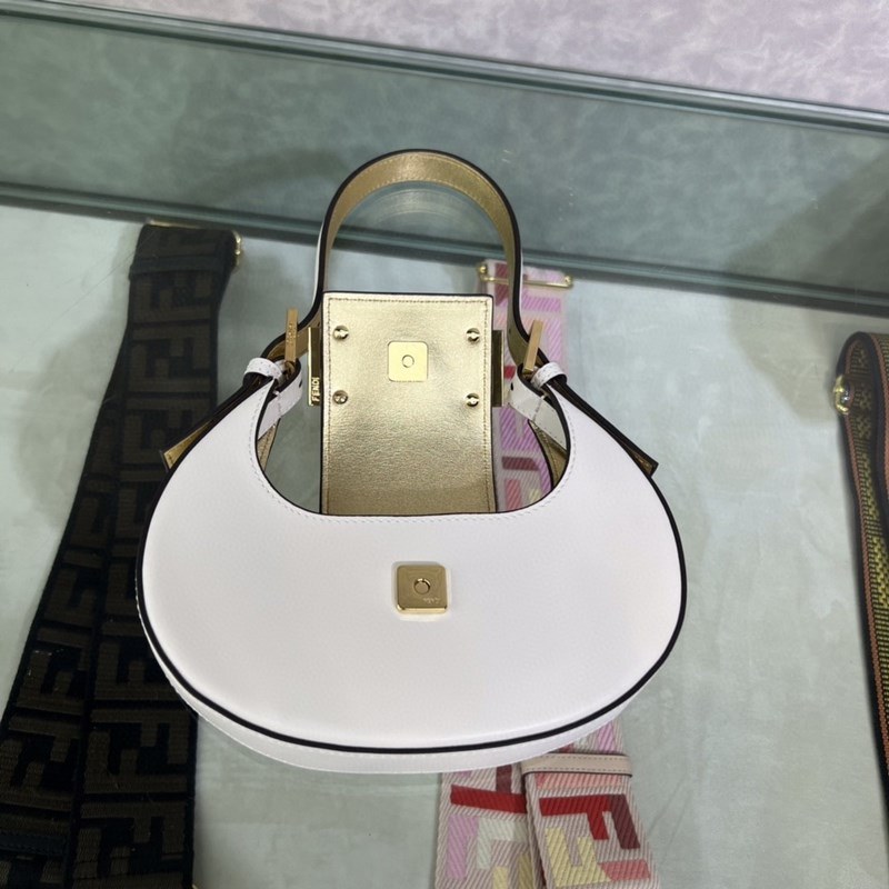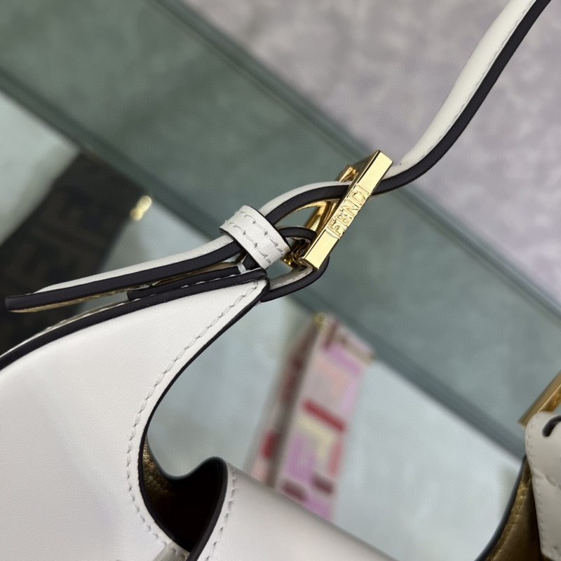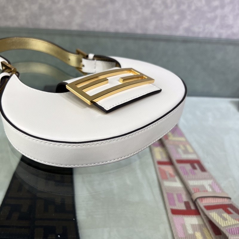 FENDI 쿠키 미니 초승달 가방 흰색 송아지 가죽으로 만든 FF 걸쇠 + 안감 있는 내부 수납공간 금색 금속 부품 조절 가능한 스트랩 손이나 팔 아래로 운반할 수 있다. 크기: 22*17.5*4.5CM