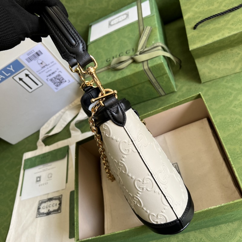 오리지널 그린 박스 포장 풀 세트 포함 GG 숄더백의 작은 사이즈는 매 시즌 새롭게 해석되는 GG 패턴을 특징으로 하며 수십 년에 걸친 풍부한 유산을 축적해 왔습니다. 이 상징은 브랜드 창립자의 이니셜을 나타낼 뿐 아니라 1930년대부터 Gucci 마름모 패턴에 대한 찬사를 섬세한 디테일로 표현합니다. Gucci의 다양한 유산을 융합함으로써 이 패턴은 브랜드의 기원에 충실하면서도 끊임없이 혁신하고 있습니다. 이 작은 검은색 숄더백은 모노그램 패턴이 엮인 장식으로 장식되어 있습니다. 세부 정보 숨기기 · 블랙 프린트 엠보싱 GG 가죽 · 골드톤 하드웨어 · Gucci 태그가 부착된 선택 품목인 이 제품은 NFC 기술을 지원하여 진품 여부를 확인하고 디지털 및 혁신적인 경험을 즐길 수 있도록 도와줍니다. 면과 리넨 안감 · 내부: 지퍼 포켓 1개 · 손잡이 높이: 15cm · 탈착식 어깨 스트랩(30cm 길이) · 이중 G와 스터드 잠금장치로 장식됨 · 무게: 약 0.6kg. 상품 번호: 675788. 작은 사이즈: 25cm x 21cm x 9cm. 색상: 블랙 앤 화이트/엠보싱 처리된 풀 레더. 아이템 번호: XP96181160