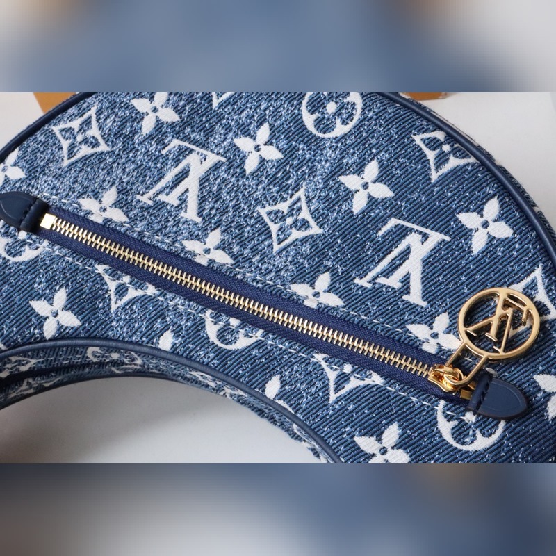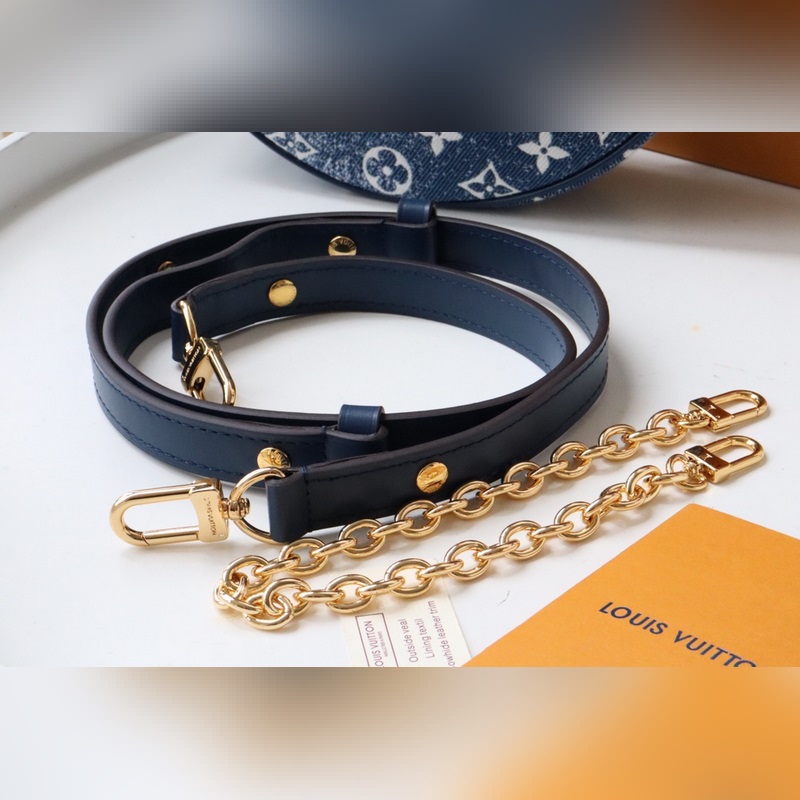 LV 아이템 번호 M81166 데님 블루 루프 바게트 몸의 움직임에 따라 변하는 컴팩트한 형태 라운드 LV 지퍼가 달린 앞쪽 지퍼 포켓 어깨에 메거나 몸에 걸칠 수 있는 체인과 가죽 어깨 스트랩 모노그램 캔버스와 강화된 가죽 모서리로 빈티지한 느낌 어깨에 메거나 몸에 걸칠 수 있는 길이 조절이 가능한 어깨 스트랩 가죽 체인이 달린 데님 어깨 스트랩 지퍼를 살짝 당겨서 소지품을 쉽게 꺼낼 수 있음. 크기: 24.0 x 22.0 x 6.0cm 아이템 번호: LD9618920