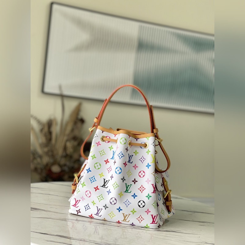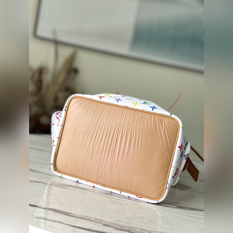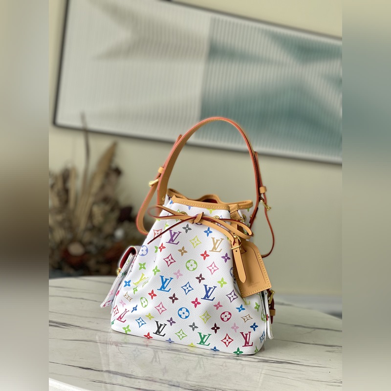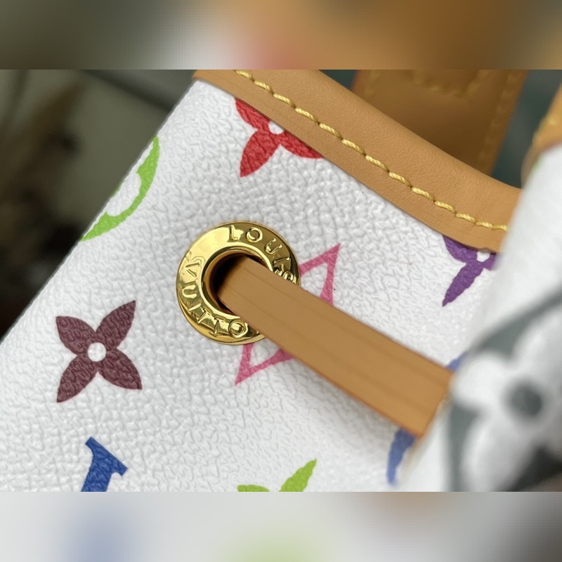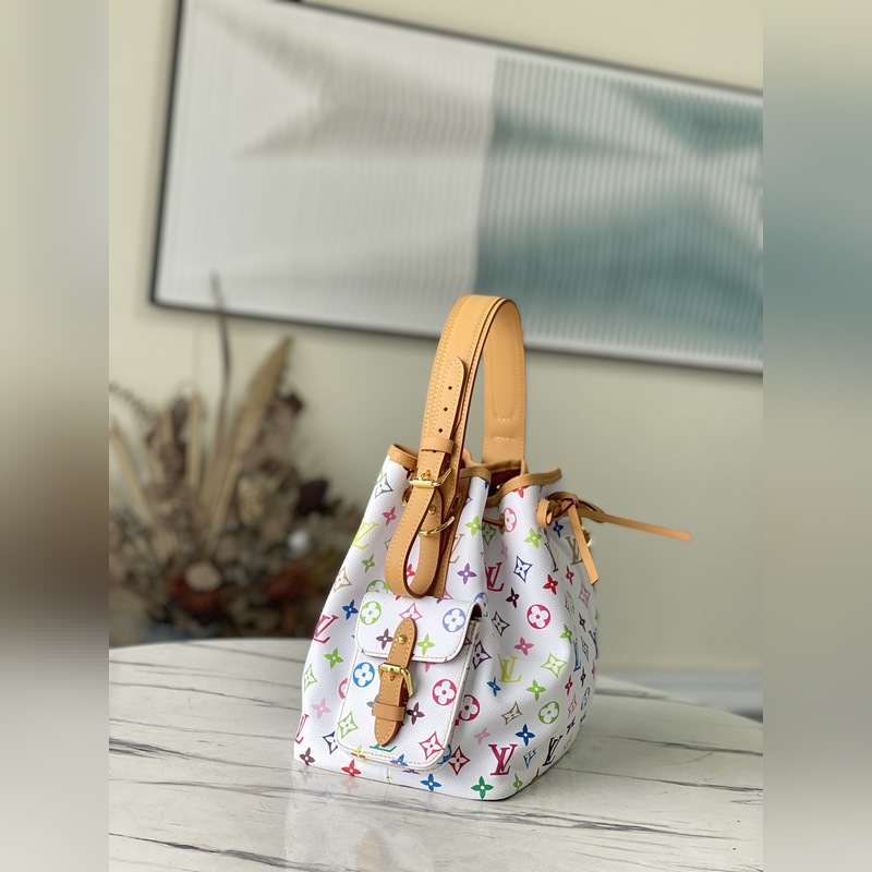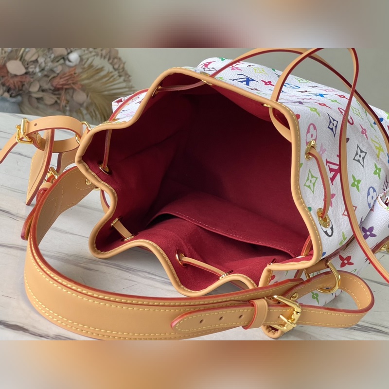 LV 모델 번호: M42229 흰색 캔버스 끈 달린 가방 무라카미 다카시 씨가 디자인한 캔버스로 제작. 넉넉한 공간. 샴페인 가방에서 영감을 받은 노에 시리즈 가방 중 하나. 단단한 구리로 만든 하드웨어. 레이저로 각인 및 절단. 33가지 색상으로 맞춤 제작된 원단. 수입 카멜레온 양가죽. 크기 25X27X18CM 아이템 번호: SG96181250