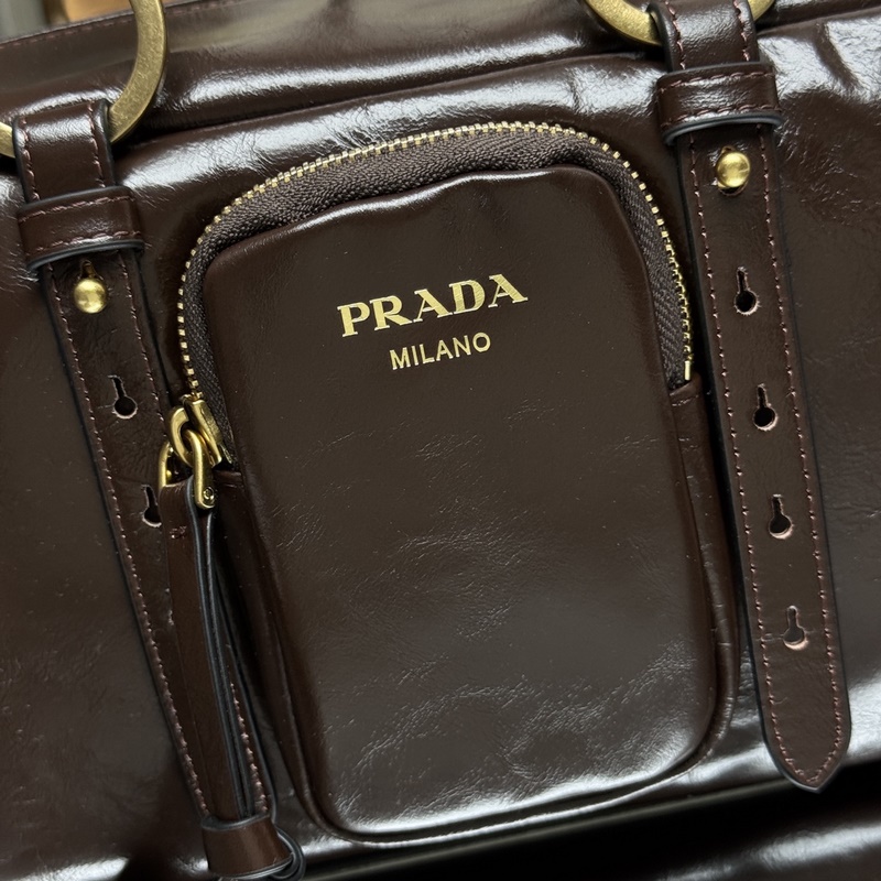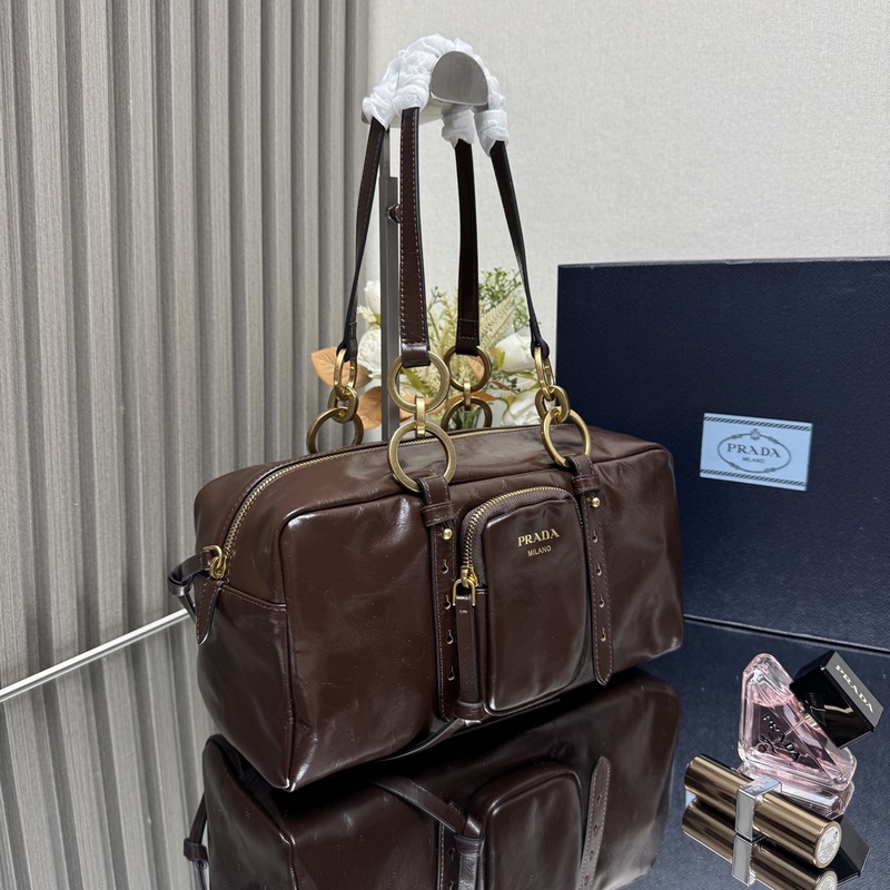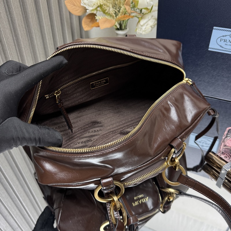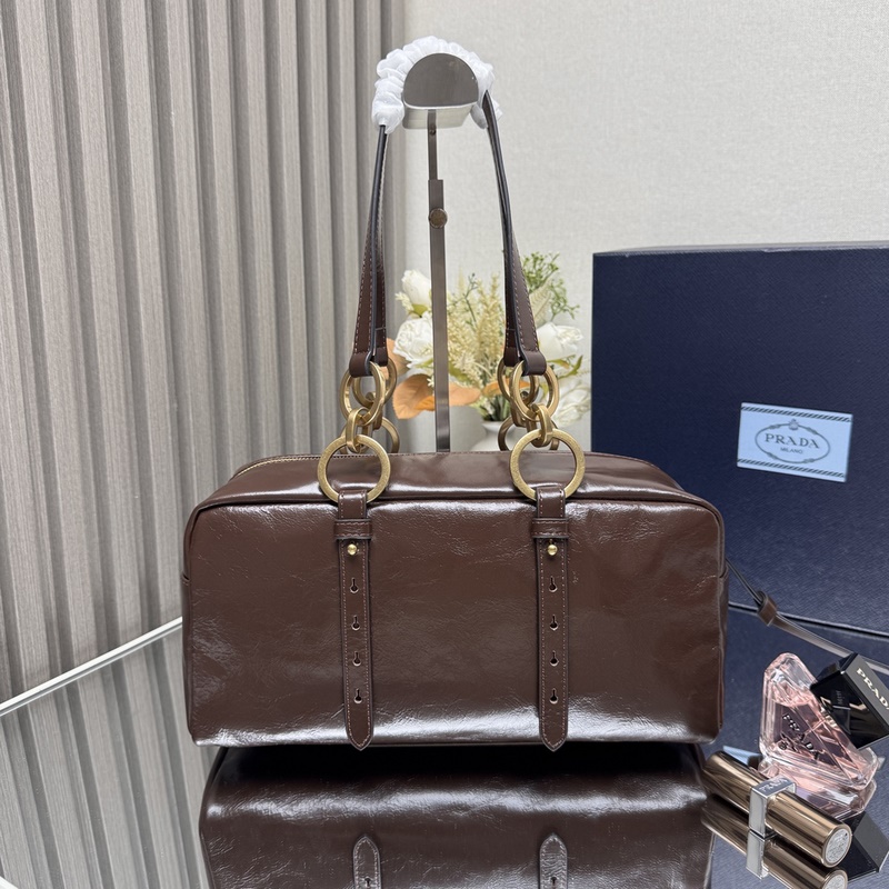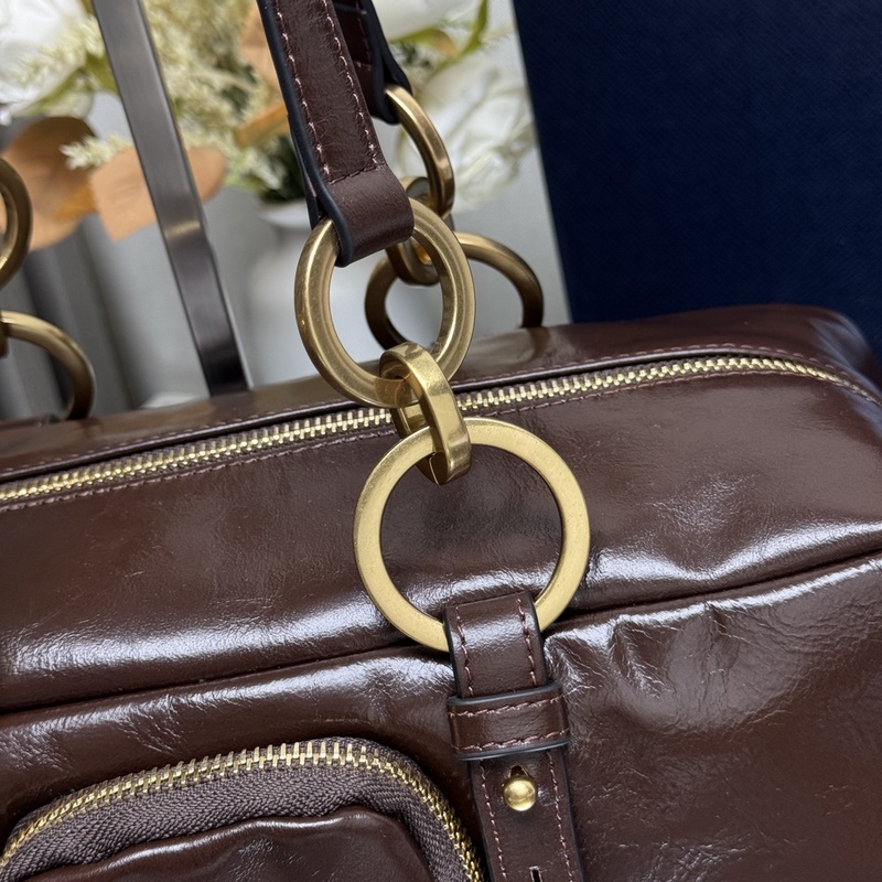 [프리미엄 오리지널] (신상 오일왁스 가죽) 대용량 빈티지 가죽 핸드백 1BB138 오리지널 오일왁스 가죽 부드러운 기하학적 디자인으로 핸드백을 새롭게 재해석 빈티지 감성의 광택 가죽으로 제작. 빈티지 메탈 하드웨어와 클래식한 지퍼 포켓이 복고적 매력을 더합니다. 사이즈: 길이 30 x 높이 14 x 너비 13.5 cm