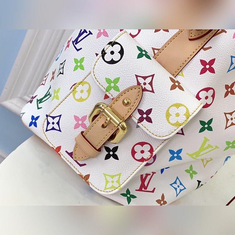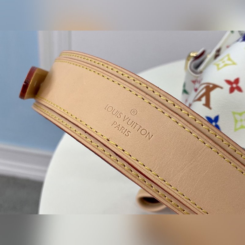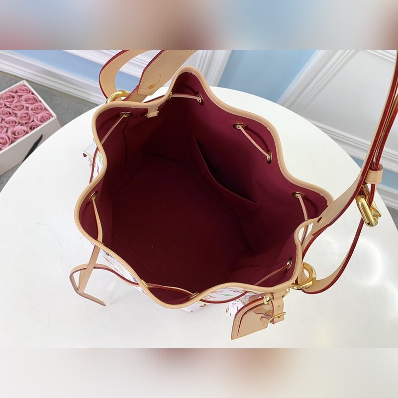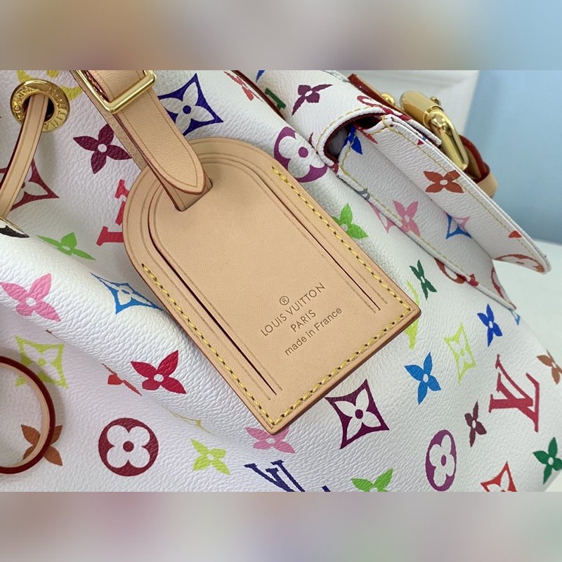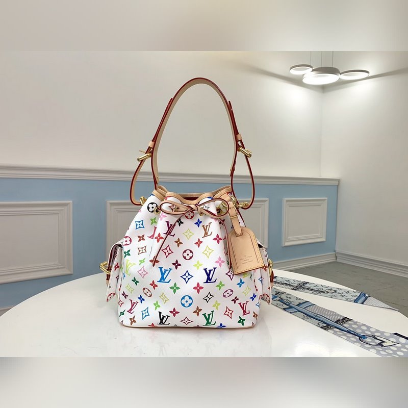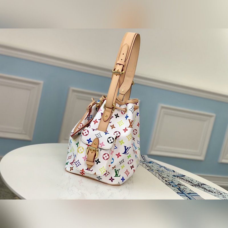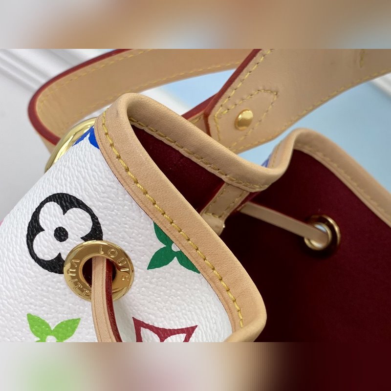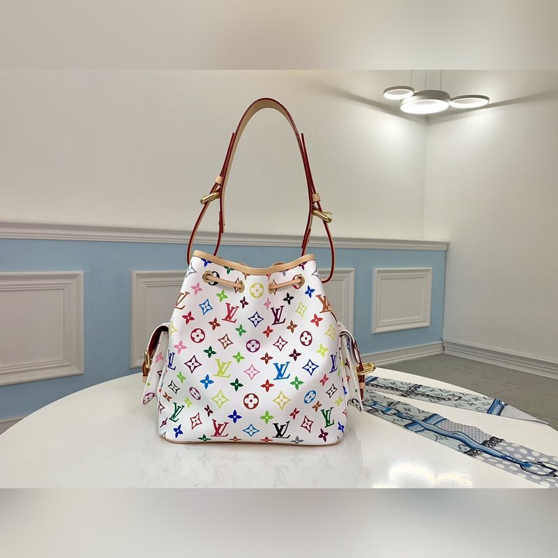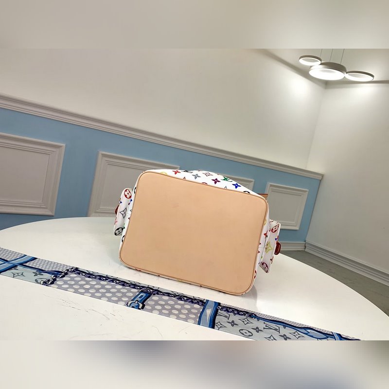 LV 클래식 리턴 모델 M42229 화이트 캔버스 버킷 백 이 드로스트링 백은 다카시 무라카미의 모노그램 멀티컬러 캔버스로 만들어졌습니다. 넉넉한 크기로 샴페인 백에서 영감을 받은 노에 시리즈 백 중 하나입니다. 단종되었습니다. 일반 복제품이 아닙니다. 하드웨어는 단단한 구리로 만들어졌으며 레이저로 각인 및 절단되었습니다. 원단은 33가지 색상으로 특별 주문 제작되었으며 카멜레온 양가죽으로 수입되었습니다. 크기 25X27X18CM 항목 번호: SG96181380