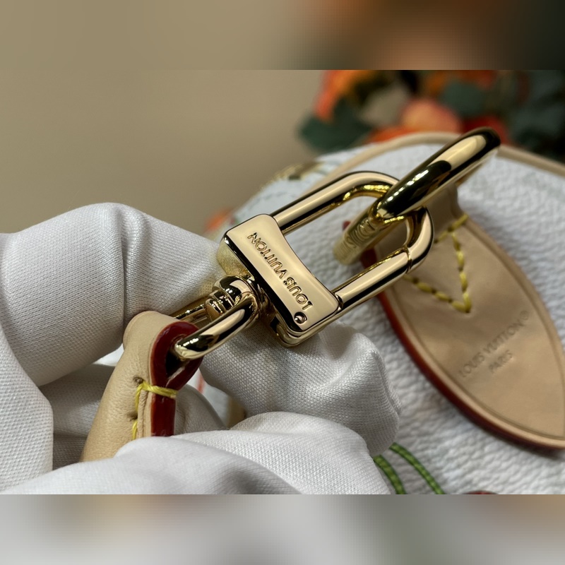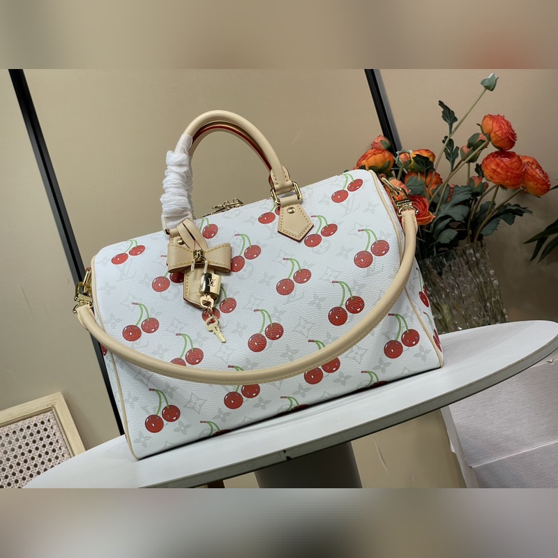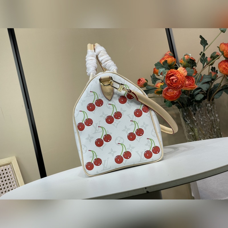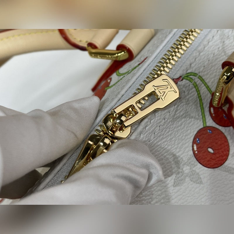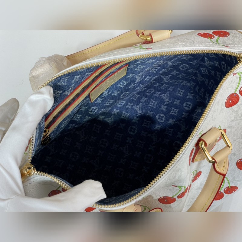 최상급 원단 복제품 독점 실물 촬영 [ Speedy Soft 30 핸드백] M14238 화이트 플라워/체리 루이 비통 x 무라카미 타카시 리메이크 시리즈의 개성적인 미학을 만나보세요. 모노그램 코팅 캔버스는 이번에는 깔끔한 색상으로 선택되어 일본 예술가의 화려하고 열정적인 체리 패턴을 돋보이게 합니다. 내부는 데님 천으로 구성되었으며 토론 소재의 상단 핸들과 탈부착 가능한 토론 숄더 스트랩은 가죽으로 제작되었습니다. 리본 모양 키 케이스가 디테일을 더합니다. 사이즈 : 17 x 30 x 21 cm