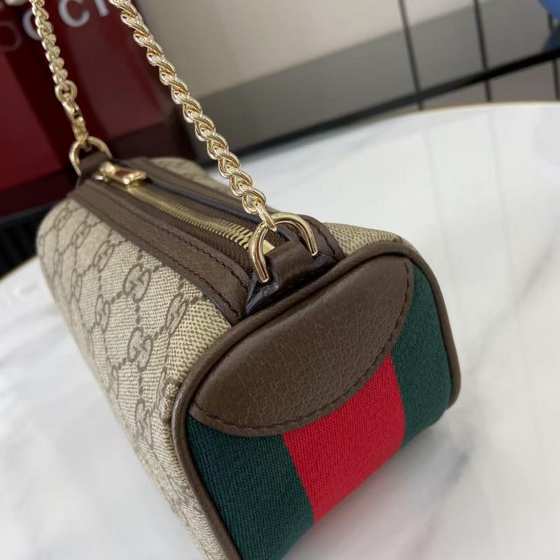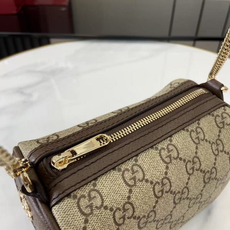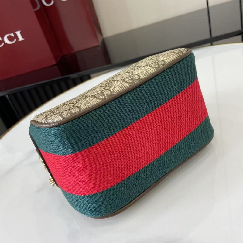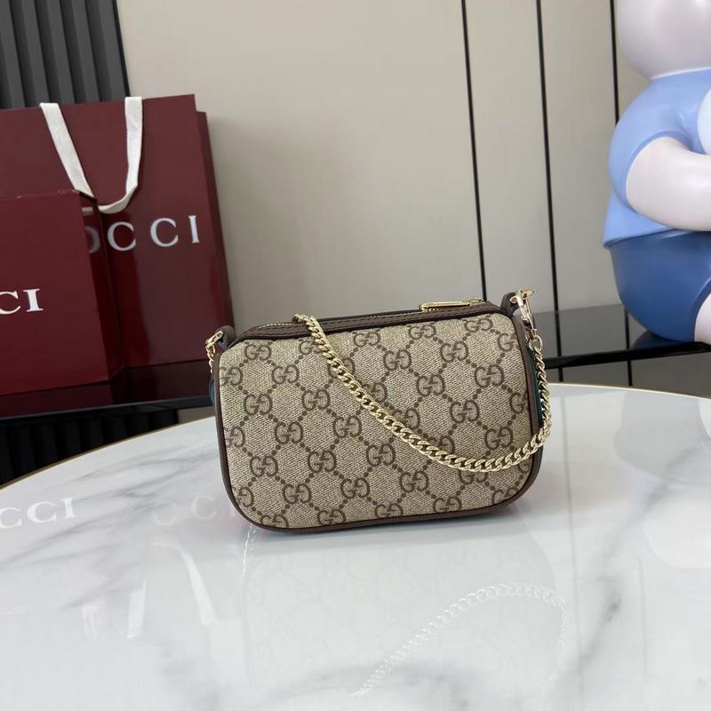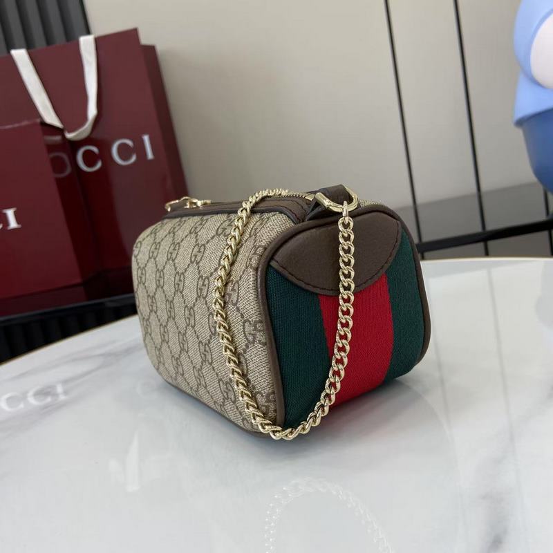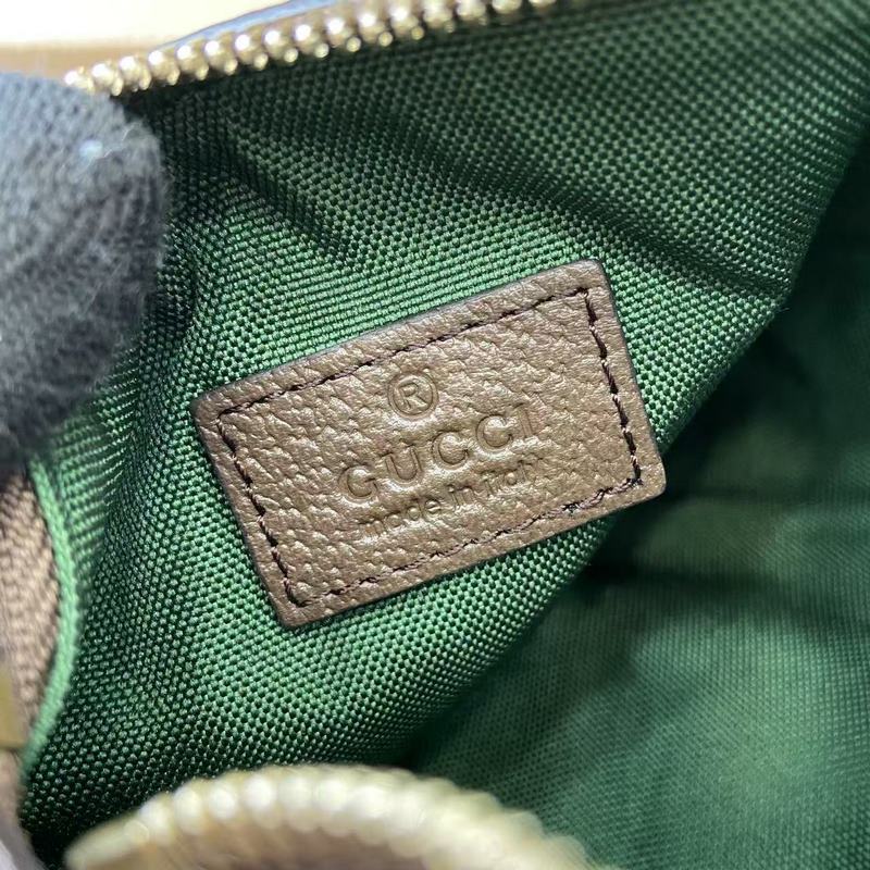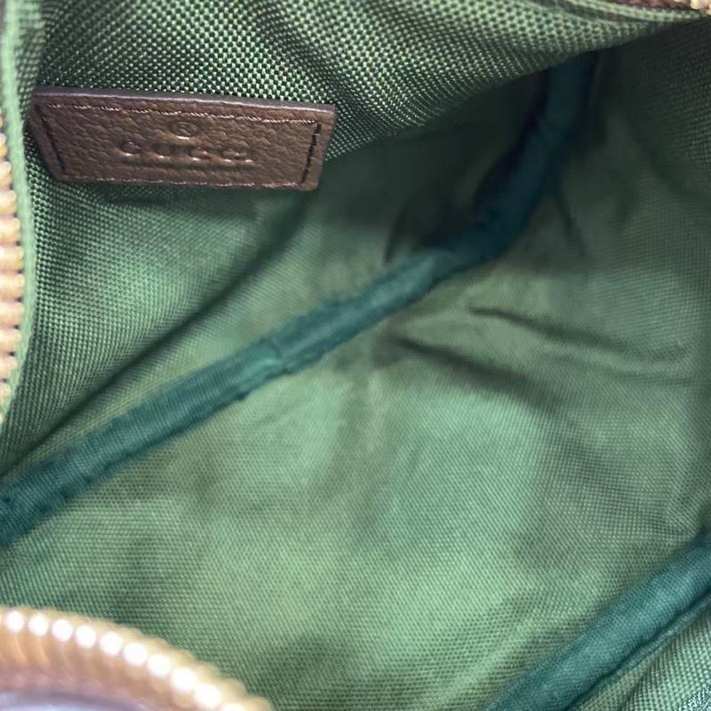 Ophidia 시리즈는 클래식한 스트라이프 직물과 옅은 골드 톤의 더블 G 로고로 브랜드의 오랜 전통을 기립니다. 이 미니 핸드백은 후크가 달린 체인 스트랩이 함께 제공되어 다양한 스타일링이 가능합니다. 베이지와 다크 브라운 GG 로고가 교차된 패턴의 코팅 직물 갈색 가죽 롤링 마감 옅은 골드 톤 액세서리 그린 리넨 코튼 혼방 안감 더블 G 리본 체인 숄더 스트랩 후크 클로저 스트랩 높이: 22cm 지퍼 여밈 모델: 838475. 사이즈: 16cm(너비) x 10cm(높이) x 8cm(깊이) 무게: 약 217g 색상: 브라운/PVC.