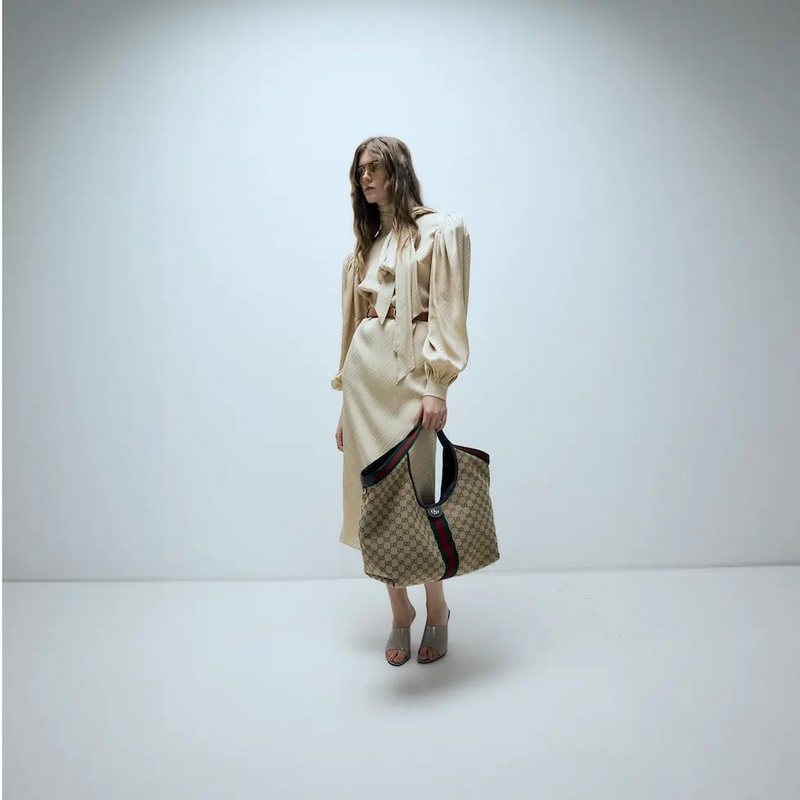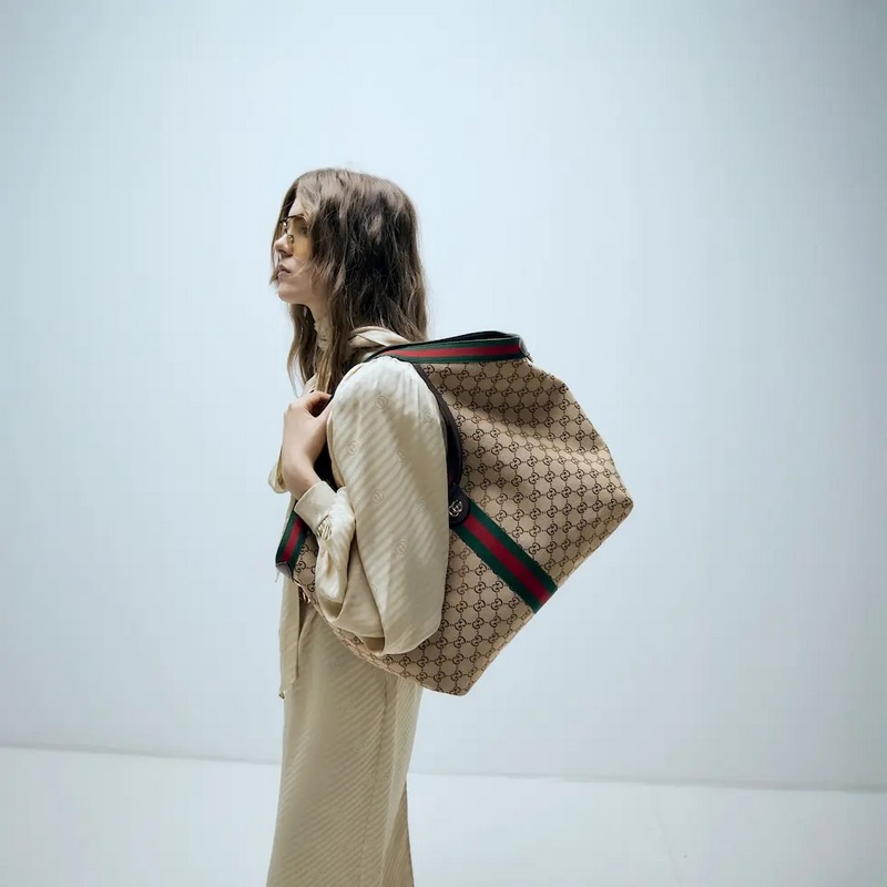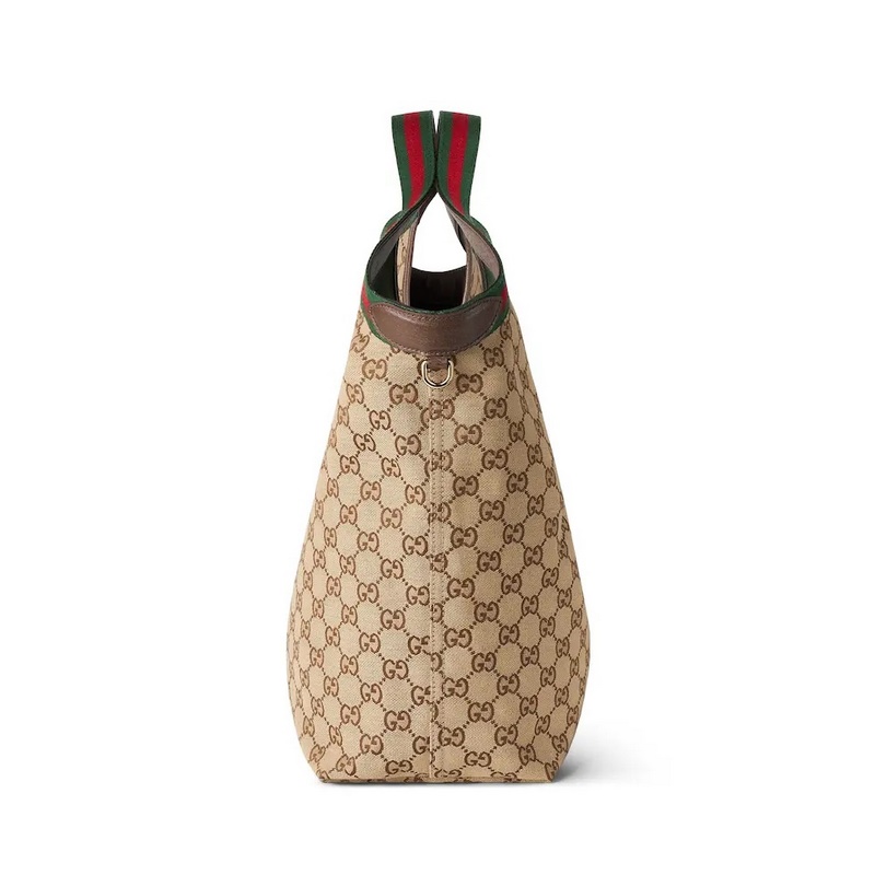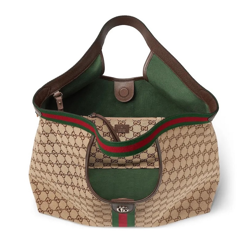 구찌 질리오(Giglio) 컬렉션이 피렌체에서 열린 2026 프리컬렉션 패션쇼에서 새롭게 선보이며 브랜드의 이탈리아적 뿌리에 경의를 표하고 영원한 전통과 혁신 정신을 조화시켰습니다. 이 대용량 토트백은 GG 캔버스로 정교하게 제작되었으며 직조 테두리 장식이 더해졌고 분리 가능한 클러치가 함께 제공됩니다. 미백과 짙은 갈색 GG 캔버스 빨강과 초록색 직물 테두리 장식 녹색 면 안감 더블 G 분리 가능한 클러치 포함 상단 손잡이: 높이 18cm 자석 버튼 여밈 모델: 853971. 사이즈: 60cm(너비) x 47cm(높이) x 16cm(깊이) 무게: 약 0.6kg 색상: 살구색 천/갈색.