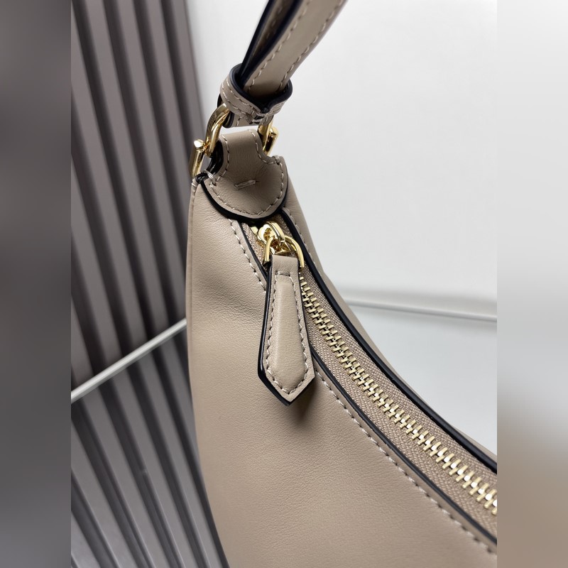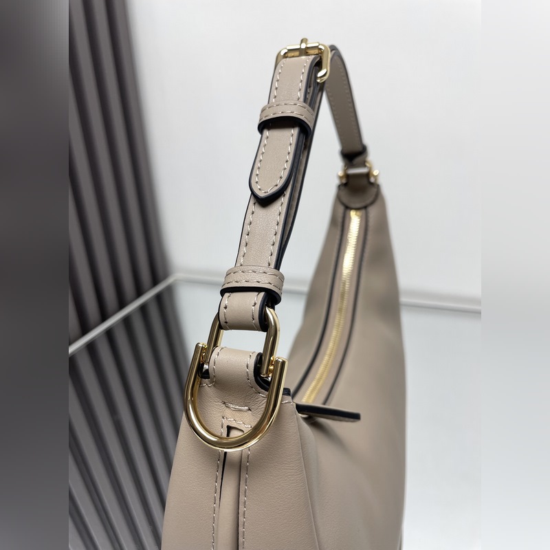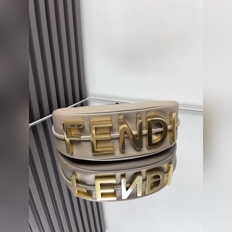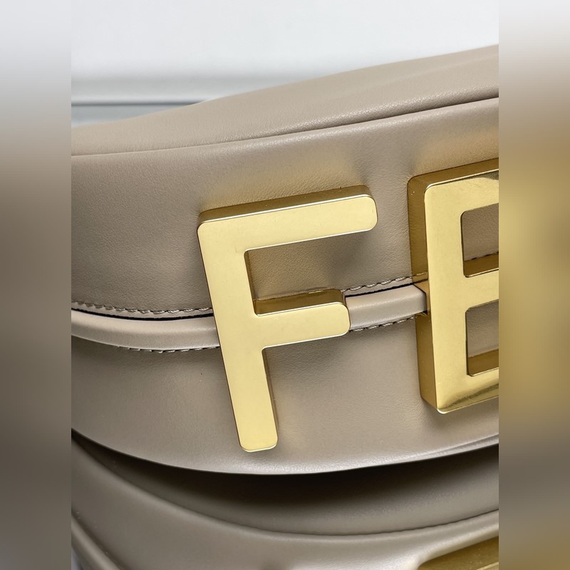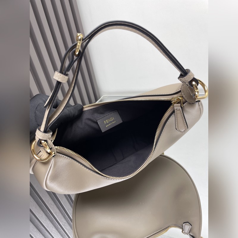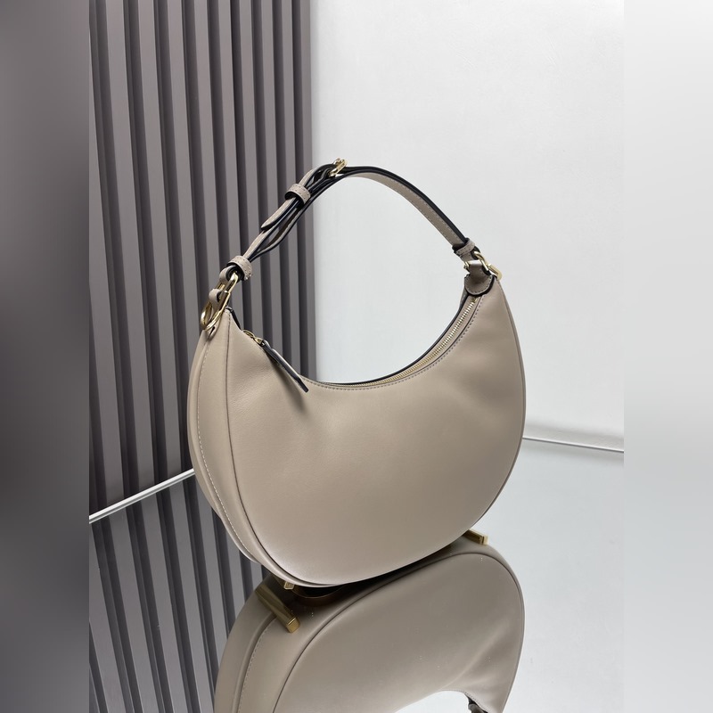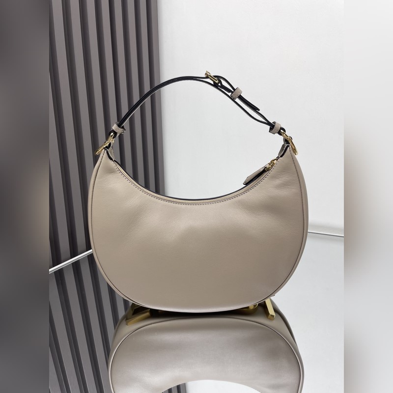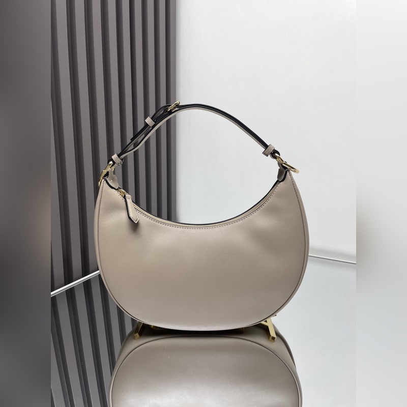 미디움 꿩회색 praphy 겨드랑이 가방 초승달 모양이 특징이며 클래식한 금속 대형 로고를 [Fendi] 가방 하단에 장식되어 있으며 가방의 실루엣은 몸의 라인을 잘 따라가며 겨드랑이에 메었을 때 패션 감각이 가득해 걸어다니는 유행 아이템 그 자체! 소형 8023B9 사이즈 29x24.5x10cm