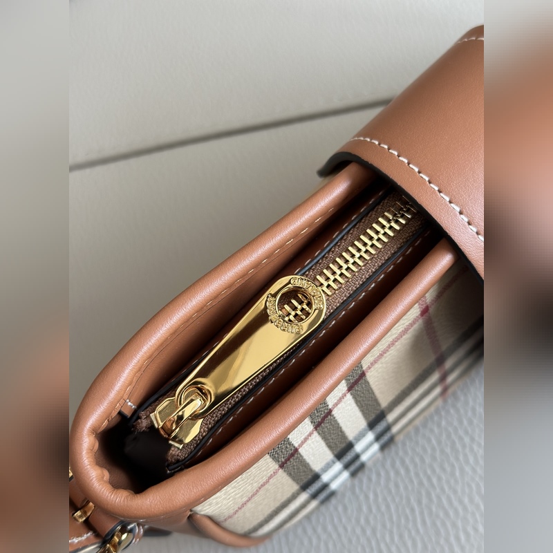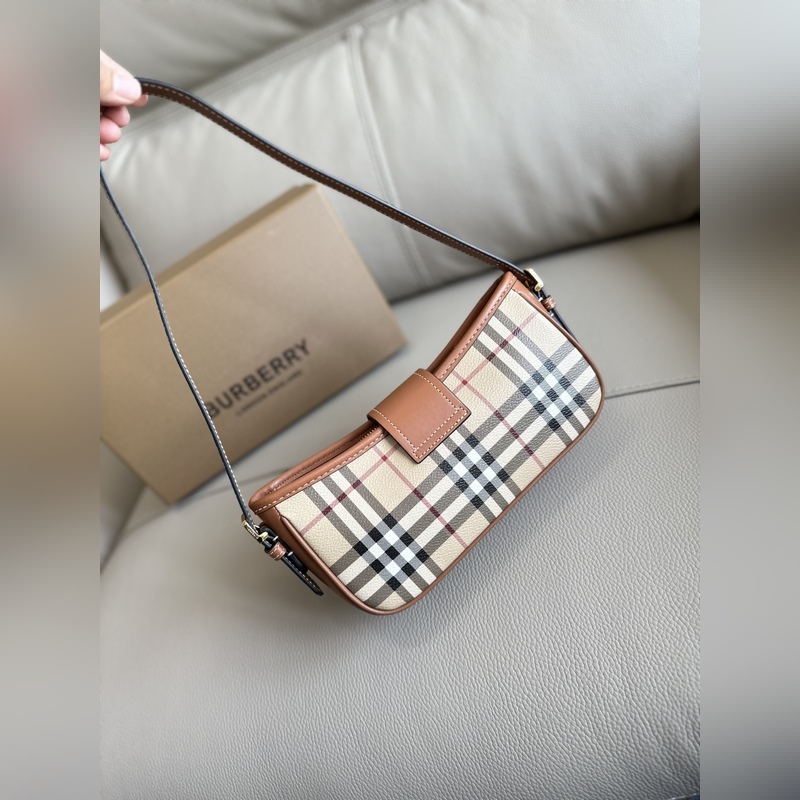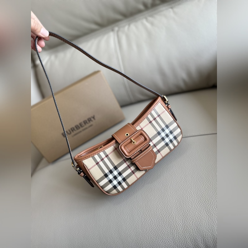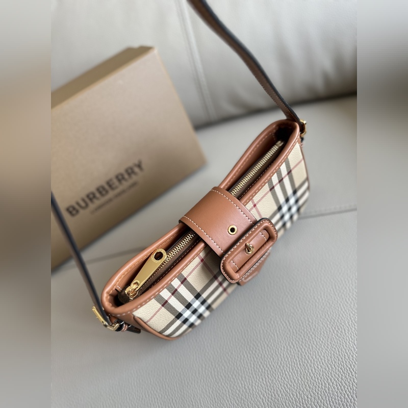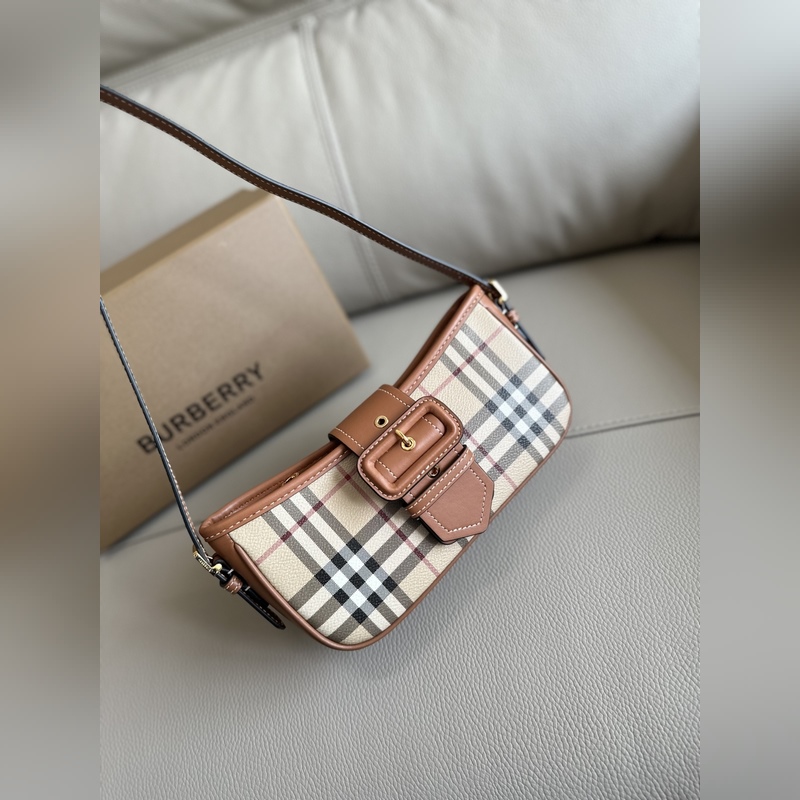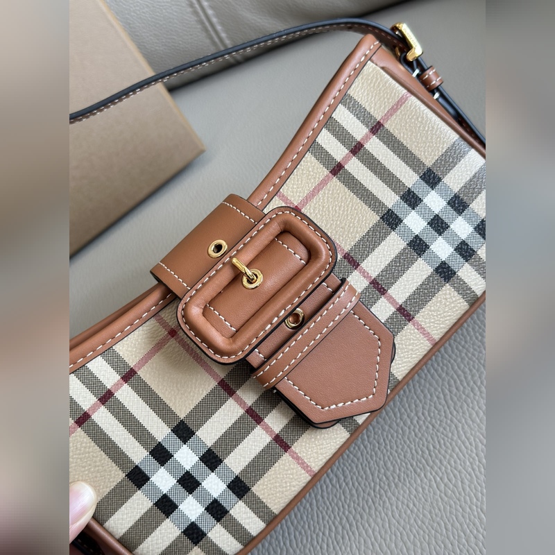 B가 최신 이탈리아 제작 가방 버버리 체크 패턴 장식. 눈에 띄는 버클 스트랩 디자인은 브랜드의 상징적인 트렌치코트에서 영감을 받았습니다. 26 x 6 x 12 모델 563153