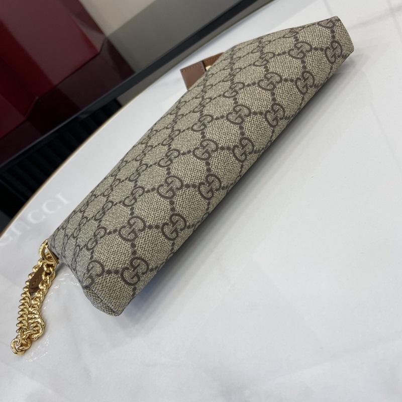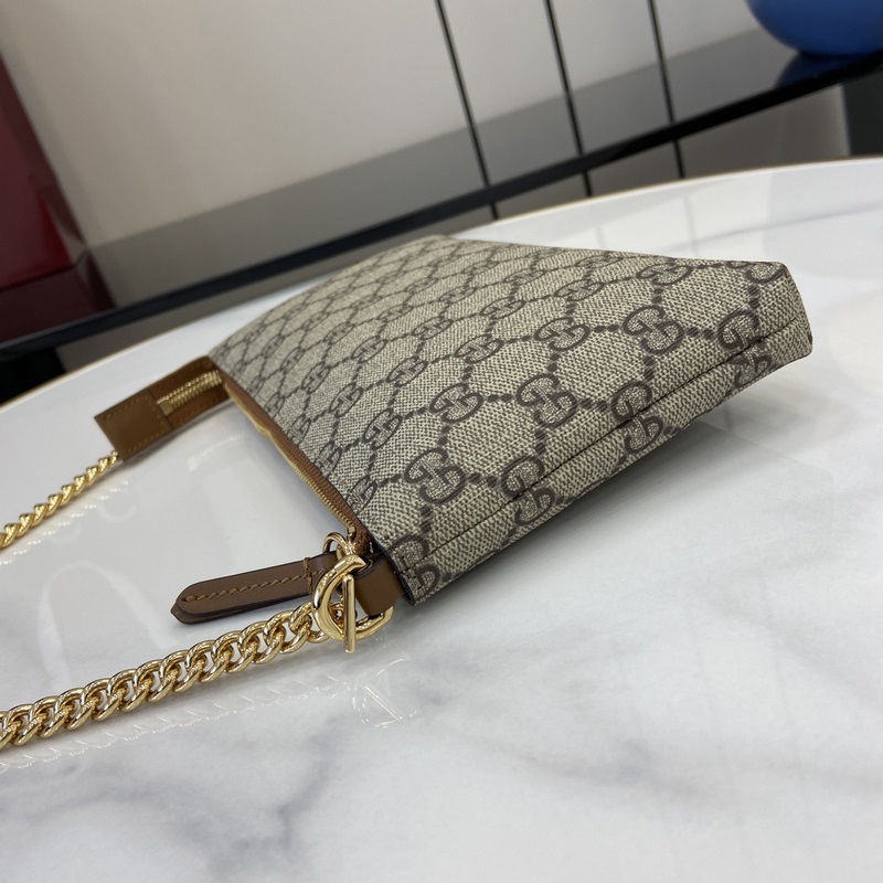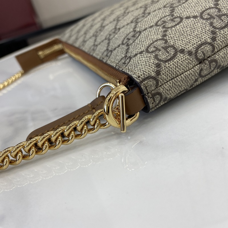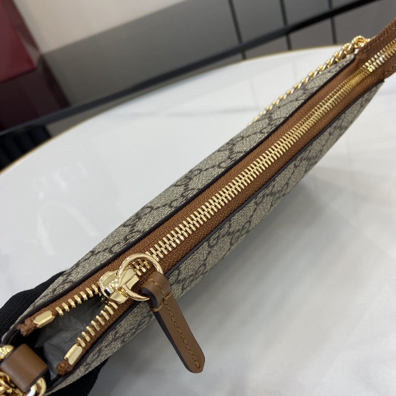 【신제품】 구찌 최신 GG Supreme 고급 PVC 소재에 원본 가죽 체인 스트랩이 적용된 가방/마작 가방 모델 번호: 779791. 크기: 22.5cm (길이) x 13cm (너비) x 2.5cm (두께) 색상: 브라운 PVC 가죽/원본 가죽. 이탈리아 디자인.