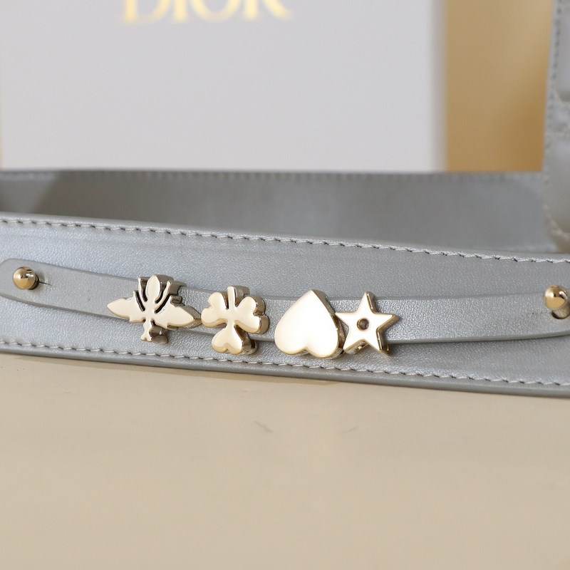소형 레이디 디올 마이 ABCDior 핸드백 진주 광택 회색 양가죽 라탄 패턴 독점 채널 다이애나 백 4칸 다이애나 백 진주 광택 회색 양가죽 금색 버튼 이 레이디 디올 마이 ABCDior 핸드백은 디올의 우아함과 아름다움에 대한 깊은 통찰을 완벽히 담아냈습니다. 진주 광택 회색 양가죽으로 정교하게 제작되었으며 짚무늬 그물 패턴의 스티치로 돋보이는 퀼팅 디테일을 특징으로 합니다. 세련된 우아한 디자인은 시대를 초월한 클래식을 선사합니다. 옅은 금색 장식 금속 D.I.O.R. 펜던트가 우아한 분위기를 강조합니다. 소형 사이즈로 독특한 디자인을 자랑하며 어깨 끈에 배지를 장식해 개성을 표현할 수 있으며 손잡이로 들고 다니거나 크로스백으로 착용 가능합니다. 조절 가능한 넓은 어깨 스트랩에 3개의 배지가 포함되어 개성 있는 스타일을 연출할 수 있으며 총 6개의 배지로 장식 가능합니다. 내부 지퍼 포켓 다른 자수 어깨 끈과 자유롭게 조합 가능 방진 가방 포함 크기: 20×17×8cm 코드: M0538ONGE_M900
