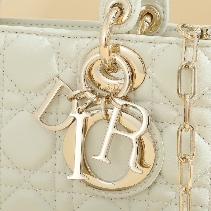 백색 양가죽 헴그라드 무늬 번호: M0613ONGE_M413 이 lady d-joy 핸드백은 lady dior 시리즈의 간결한 미학을 강조하며 dior가 우아함과 아름다움에 대한 깊은 통찰을 담아냈습니다. 흰색 양가죽으로 정교하게 제작되었으며 덩그라시 무늬의 스티치 라인이 장식되어 있습니다. 연금색 금속 d.i.o.r. 펜던트가 고급스러움을 더하며 우아한 실루엣에 생동감을 불어넣습니다. 소형 사이즈로 분리 가능한 체인 스트랩과 조절 가능하며 분리 가능한 가죽 스트랩을 갖추어 손잡이로 들고 어깨에 걸거나 크로스백으로 착용할 수 있어 일상적인 스타일링에 완벽한 선택입니다. 분리 가능한 체인 스트랩은 분리 가능하며 조절 가능한 가죽 스트랩 내장형 먼지 방지 가방 크기: 22×12×6cm