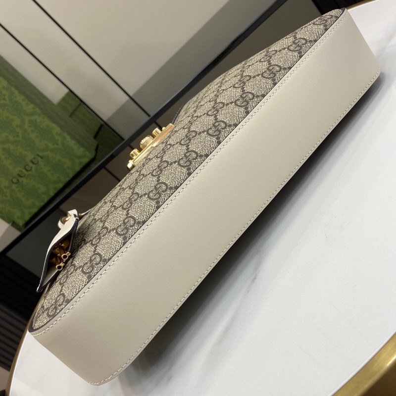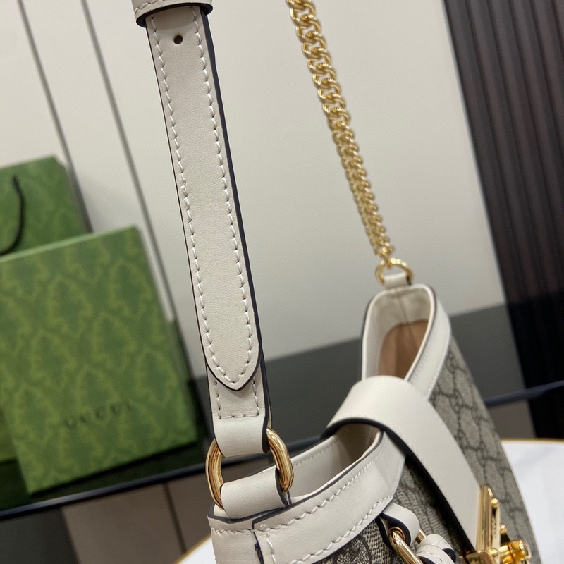 [신제품] GG 미디엄 숄더백. 이 숄더백은 GG 수프림 캔버스로 만들어졌으며 트렁크 제작 공방에서 현재에 이르기까지 브랜드의 오랜 유산을 기리는 눈길을 끄는 자물쇠 스타일의 잠금 장치가 특징입니다. 골드 톤의 피팅 부드러운 화이트 가죽 파이핑 체인 스트랩 가죽 숄더 스트랩이 작품에 마무리 터치를 더합니다. 베이지색과 흑단색 GG Supreme 캔버스 흰색 가죽 파이핑 금색 하드웨어 흰색 마이크로파이버 안감 가죽과 체인(55cm에서 70cm 사이로 조절 가능)으로 된 어깨 스트랩. 내부: 지퍼형 포켓 1개 어깨 스트랩(27cm에서 35cm 사이로 조절 가능). 잠금식 걸쇠 잠금. 모델: 795113. 크기: 32.5(가로) x 24(세로) x 5.5(깊이)cm 색상: 흰색/PVC. 무게: 약 0.7kg
