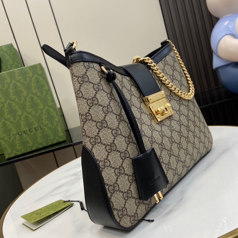 [신제품] GG 미디엄 숄더백. 이 숄더백은 GG 수프림 캔버스로 만들어졌으며 트렁크 제작 공방에서 현재에 이르기까지 브랜드의 오랜 유산을 기리는 눈길을 끄는 자물쇠 스타일의 잠금 장치가 특징입니다. 골드 톤의 피팅 검은색 광택 가죽 파이핑 체인 스트랩 가죽 숄더 스트랩이 작품에 마무리 터치를 더합니다. 베이지색과 흑단색 GG Supreme 캔버스 검은색 가죽 파이핑 금색 하드웨어 검은색 마이크로파이버 안감 가죽과 체인(55cm에서 70cm 사이로 조절 가능)으로 된 어깨 스트랩. 내부: 지퍼형 포켓 1개 어깨 스트랩(27cm에서 35cm 사이로 조절 가능). 자물쇠 잠금. 모델: 795113. 크기: 32.5(가로) x 24(세로) x 5.5(깊이)cm 색상: 검정/PVC. 무게: 약 0.7kg