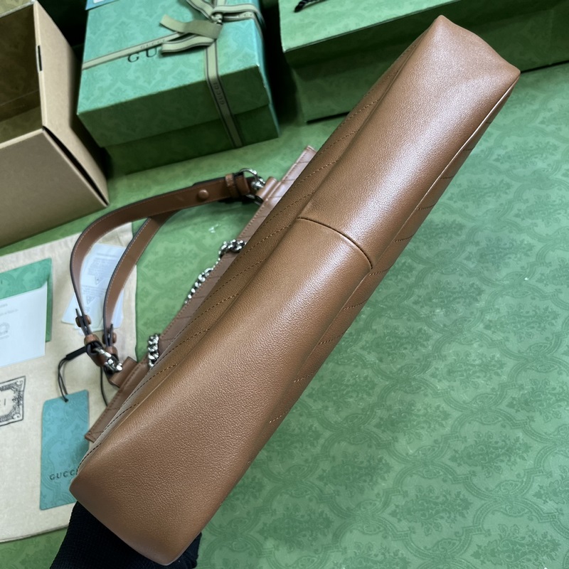 구찌 블론디 컬렉션의 미디엄 토트백. 구찌 블론디 컬렉션의 가방은 브랜드의 상징적인 심볼에서 영감을 받은 둥근 모양의 GG 로고로 장식되어 있습니다. 이 구찌 블론디 토트백은 상단 손잡이와 체인 숄더 스트랩이 특징이며 가방 본체에는 브랜드 로고가 새겨진 가죽 아플리케가 대담하게 장식되어 있습니다. 브라운 가죽 면과 리넨 안감 라운드 인터로킹 더블 G 가죽 아플리케 내부: 3개의 메인 수납공간과 1개의 지퍼 포켓 상단 손잡이(높이 20cm) 체인 숄더 스트랩(높이 42cm). 무게: 약 1.2kg. 모델: 751516. 크기: 34.5(가로) x 41(세로) x 8cm(깊이) 색상: 브라운/천연 가죽. 이탈리아 디자인