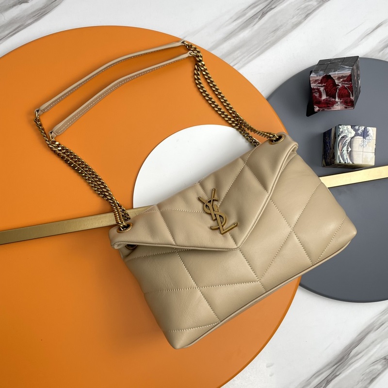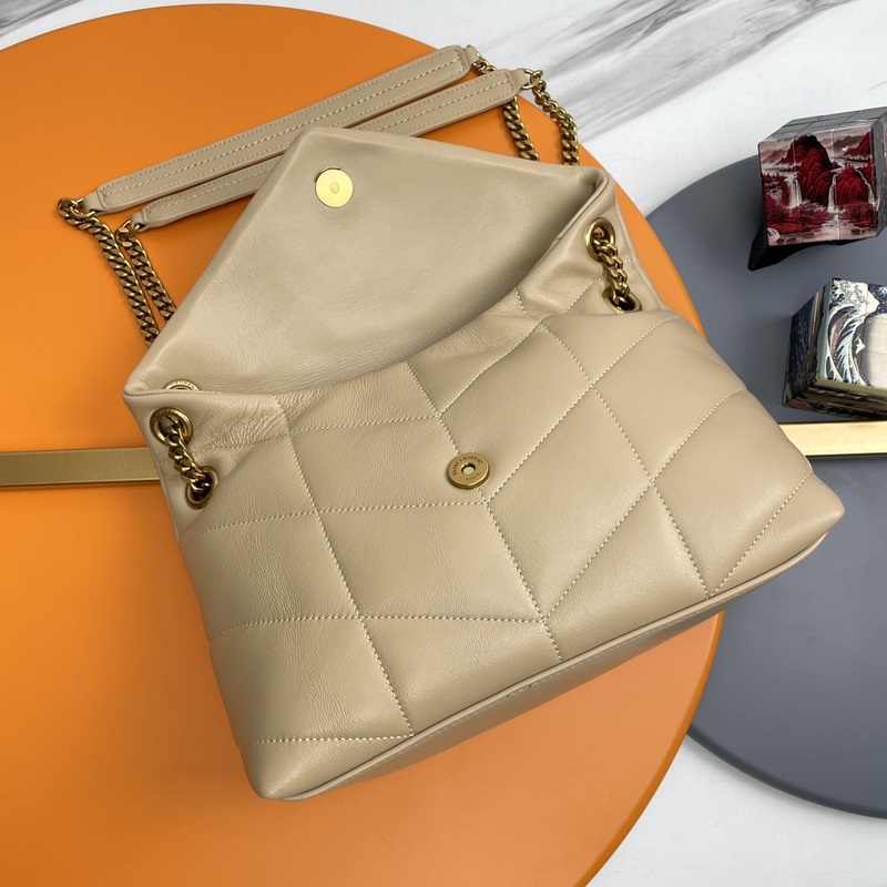# 아몬드/골드 버튼 오리지널 싱글 29cm_ LOULOU UFFER 퀼팅 양가죽 가방 100% 양가죽으로 만들어져 촉감이 부드럽고 섬세하며 마치 구름을 안고 있는 듯한 느낌을 줍니다. 클래식한 Y-패밀리 로고 체인 단추 장식 하드웨어는 모두 브러시드 메탈로 만들어져 무광택의 안개가 낀 듯한 질감과 독특한 느낌을 줍니다. 크기: 29x17x11cm 모델: 577476.Zx