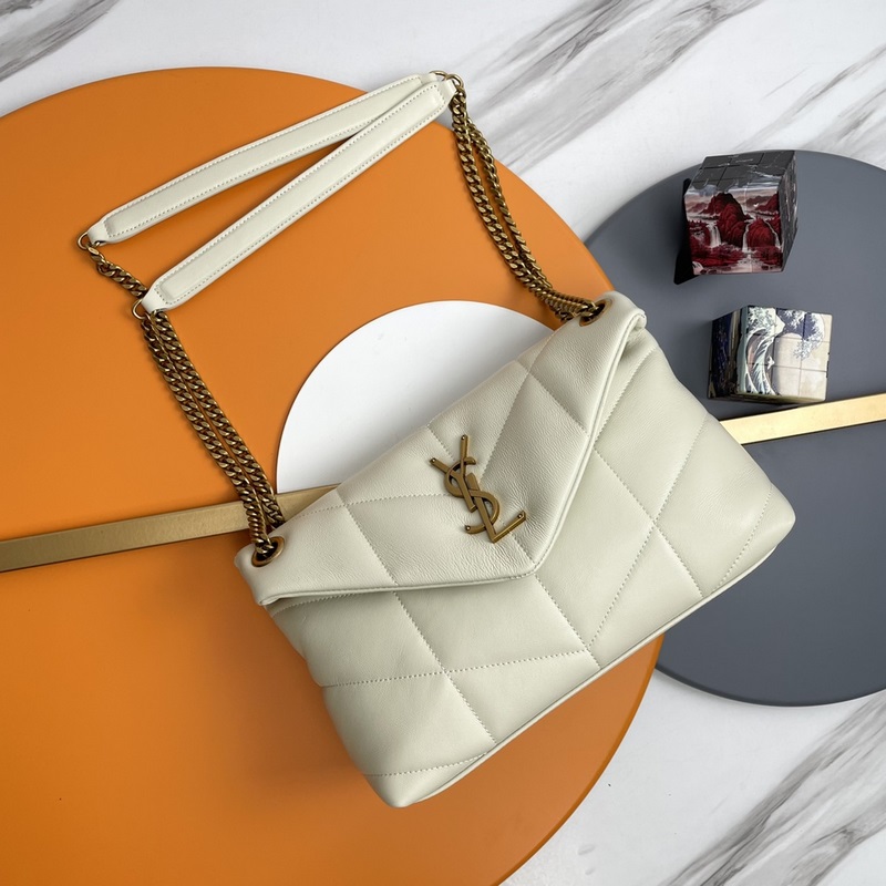 # 화이트/골드 버튼 원본 싱글 29cm_ LOULOU UFFER 퀼팅 양가죽 가방은 100% 양가죽으로 만들어져 부드럽고 섬세하며 마치 구름을 안고 있는 듯한 느낌을 줍니다. 클래식한 Y 로고 체인 버튼 하드웨어는 모두 브러시드 메탈로 만들어져 매트하고 안개가 낀 듯한 질감과 독특한 느낌을 줍니다. 크기: 29x17x11cm 모델: 577476.Zx