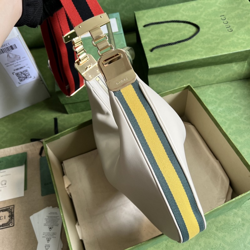 오리지널 그린 박스 포장 풀 세트 포함 시리즈 대형 숄더백 구찌 러브 마치 시리즈는 브랜드의 클래식한 요소를 새롭게 해석하고 할리우드의 영원한 매력에 대한 찬사입니다. 이 액세서리는 눈에 띄는 초승달 모양을 특징으로 하며 G자형 고리 잠금 장치가 독특한 디자인 미학을 더해 줍니다. 클래식한 액세서리와 부드러운 소재의 조합으로 복고풍의 매력을 절묘하고 낭만적으로 해석합니다. 이 큰 숄더백은 베이지색과 흰색 캔버스로 만들어졌으며 녹색과 노란색 웨빙 트림이 특징입니다. 베이지색과 흰색 캔버스 녹색과 노란색 웨빙 트림 면과 린넨 안감 추가 가죽 어깨 스트랩 내부: 지퍼 포켓 1개 G자형 고리와 지퍼가 달린 탈착식 웨빙 어깨 스트랩(높이 50cm). 모델 번호: 702823. 크기: 35(가로) x 32(세로) x 6cm(깊이) 색상: 흰색/원래 가죽. 이탈리아 디자인 번호: XP96181330
