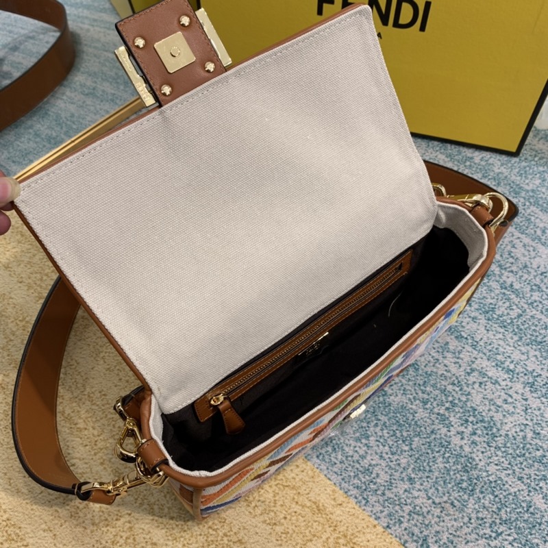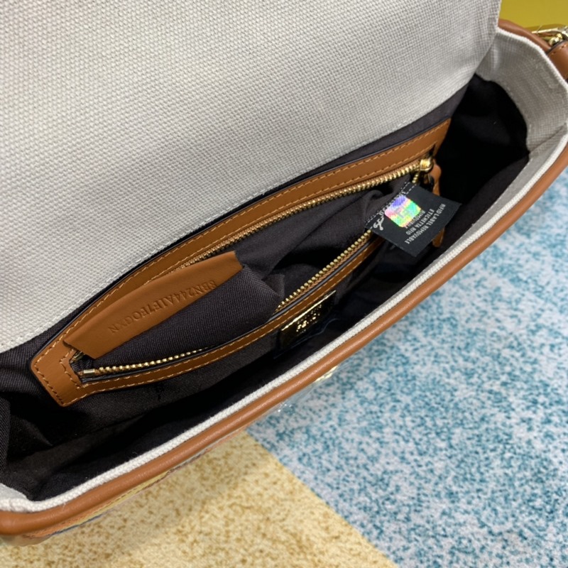 펜디 펜디 바게트 신상 길고 짧은 탈착식 어깨끈 1개 한쪽 어깨에 메거나 몸에 걸칠 수 있습니다. 대비되는 스티치가 있는 베이지색 캔버스 브라운 가죽 디테일 금색 금속 부품 크기 26cm 모델 번호: 8BR600 Sweet Fruit Denim No.: BD96181250