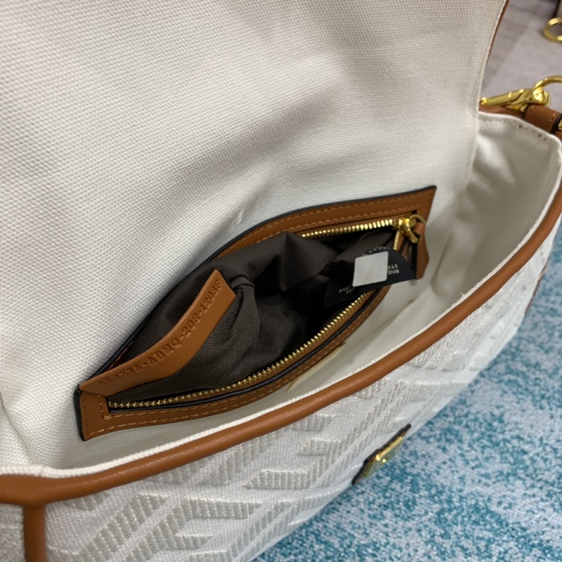 펜디 상징적인 중형 바게트 핸드백은 FF 자석 걸쇠가 달린 플랩 디자인이 특징입니다. 손에 들거나 몸에 걸칠 수 있는 탈착식 어깨 끈이 달린 지퍼 포켓이 있는 베이지색 패브릭 소재의 제품으로 FF 모티브가 자수되어 있고 골든 브라운 가죽 디테일이 장식되어 있습니다. 페퀸 패브릭 어깨 끈 골든 메탈 피팅 ☆ 번호: 8BR600 자수 화이트 크기 26cm No.: BD96181200