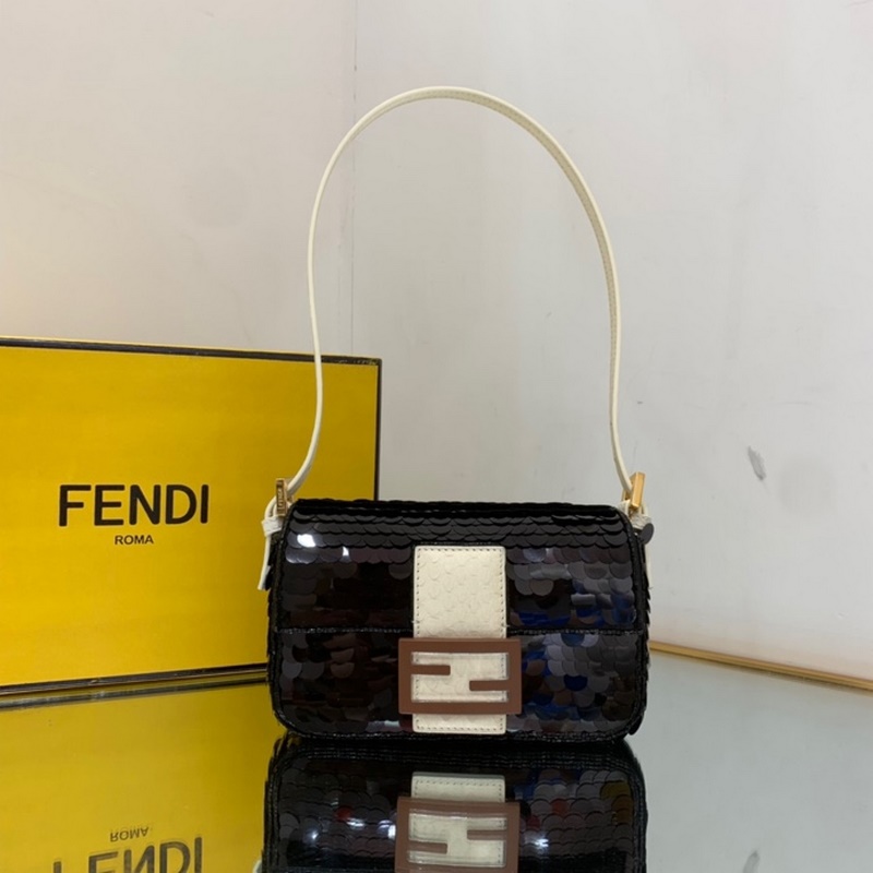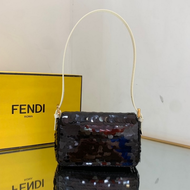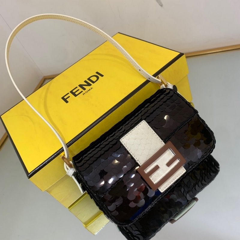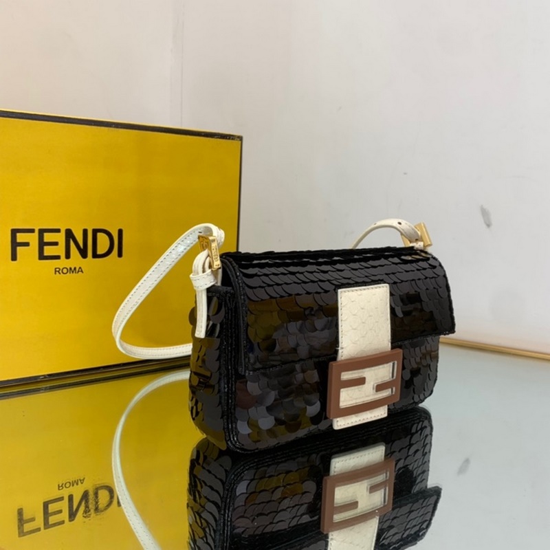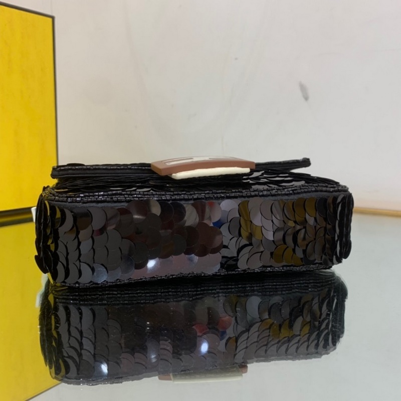 펜디 97 트럼펫 백 전체에 금색 금속 스팽글 자수 장식과 FF 버클